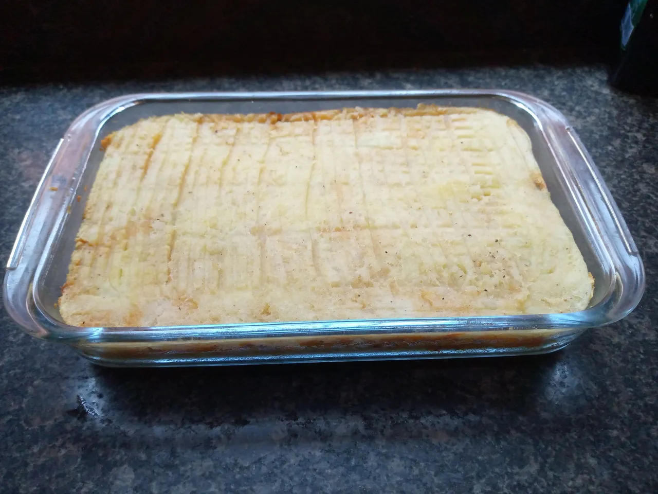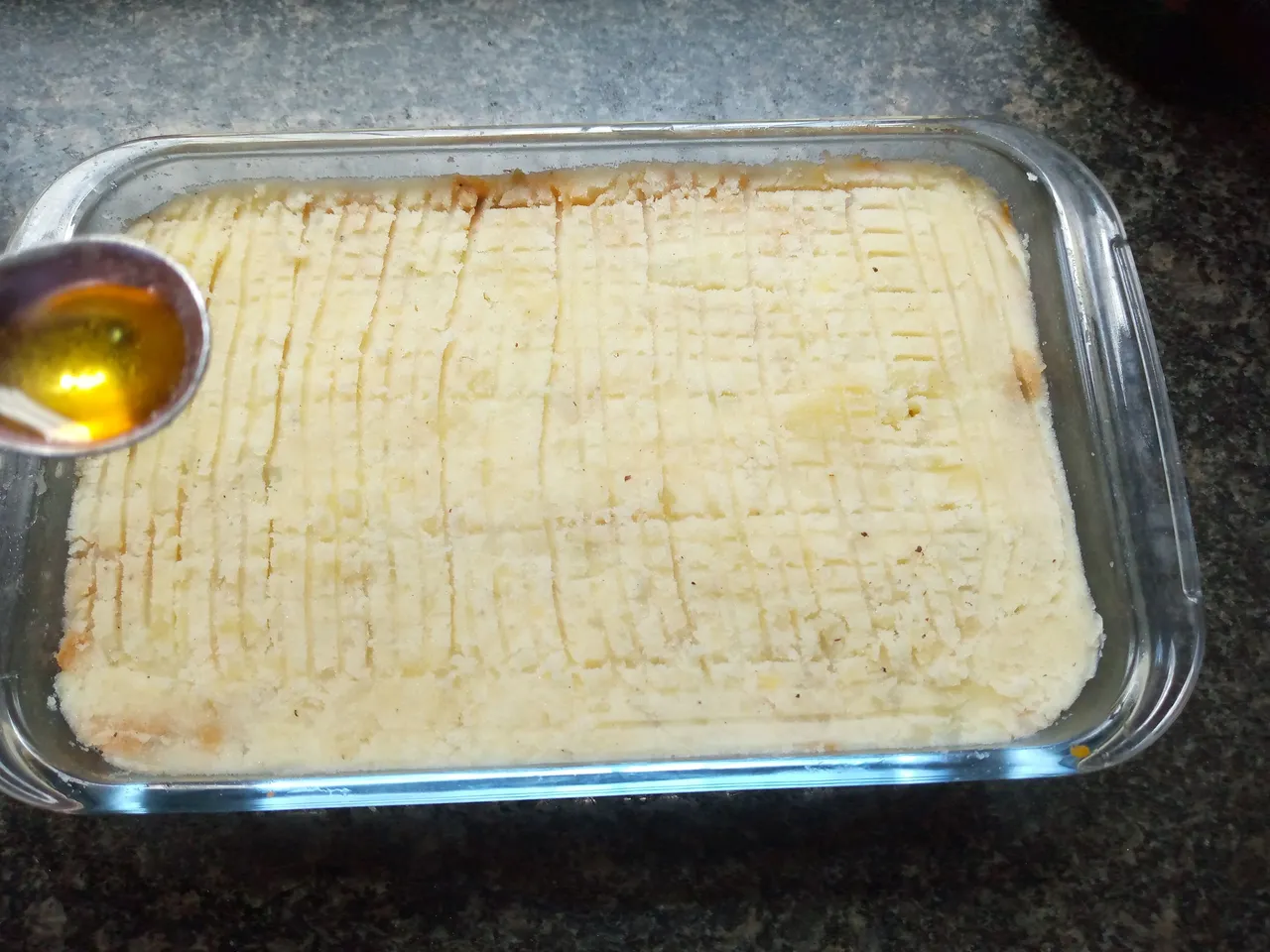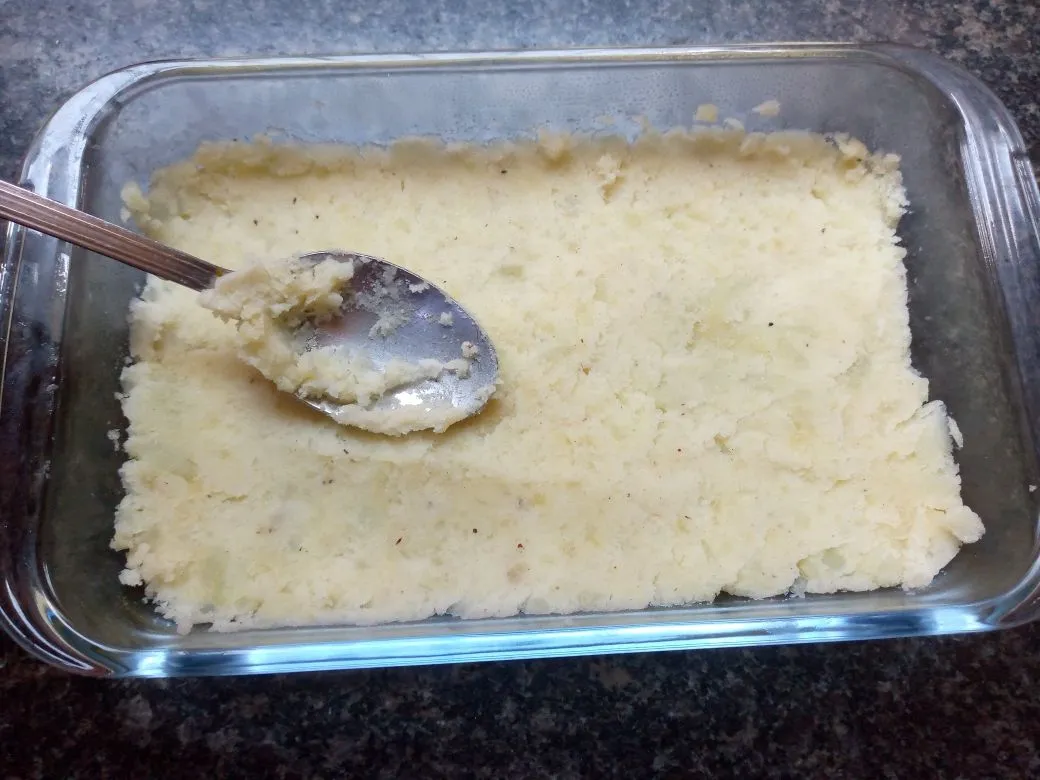 The last step is to assemble the cake, place the puree in a baking dish, spread it, then add the soy meat and finally cover it with a layer of puree with the help of a fork, make grooves and add a drizzle of olive oil, put it in the preheated oven and gratinate it for 30 minutes, then remove from the heat.