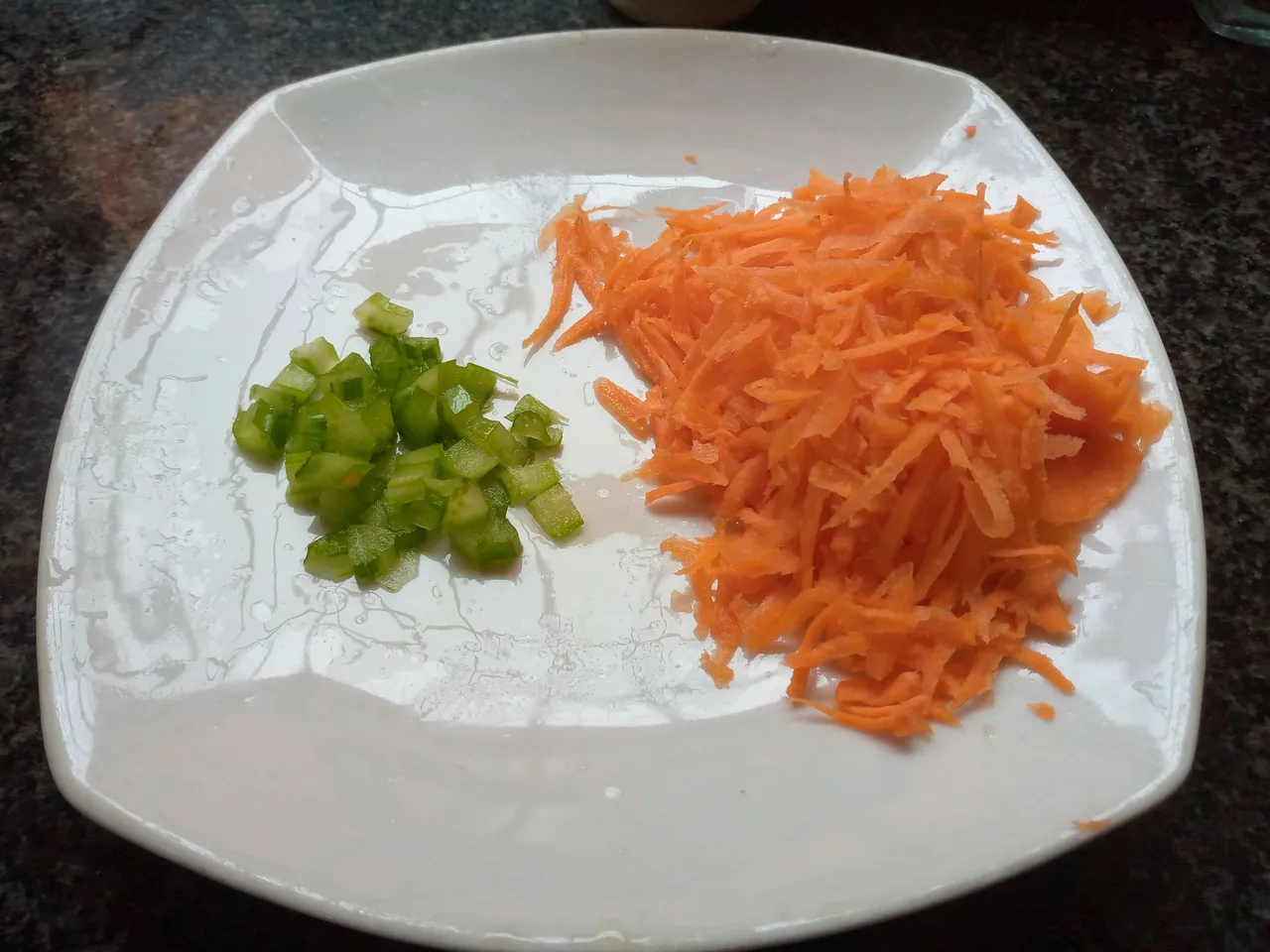 Second step is to prepare the soy meat, for this we place the soy meat in a bowl, add hot water to cover it and let it hydrate for 25 minutes, then drain it to eliminate the water, wash the vegetables that we are going to use: onion, tomato, peppers, paprika, garlic and garlic and chop them with the help of a food processor, we can also cut them finely with a knife, grate the carrot and cut the celery in small squares.