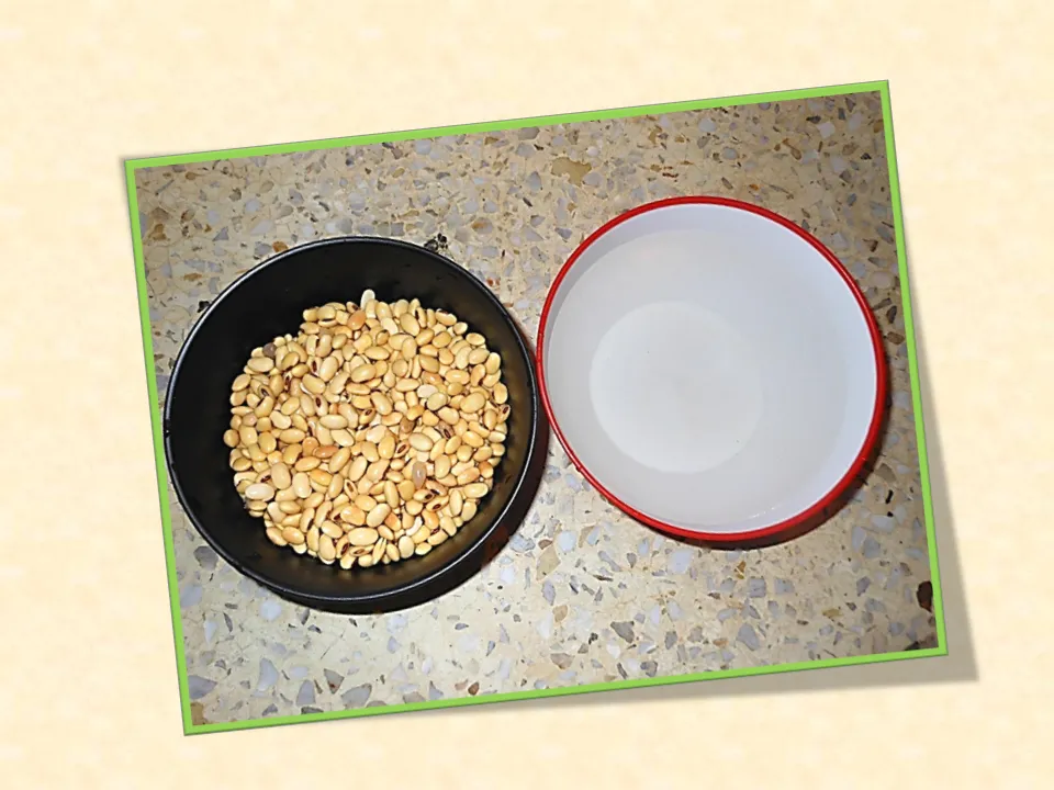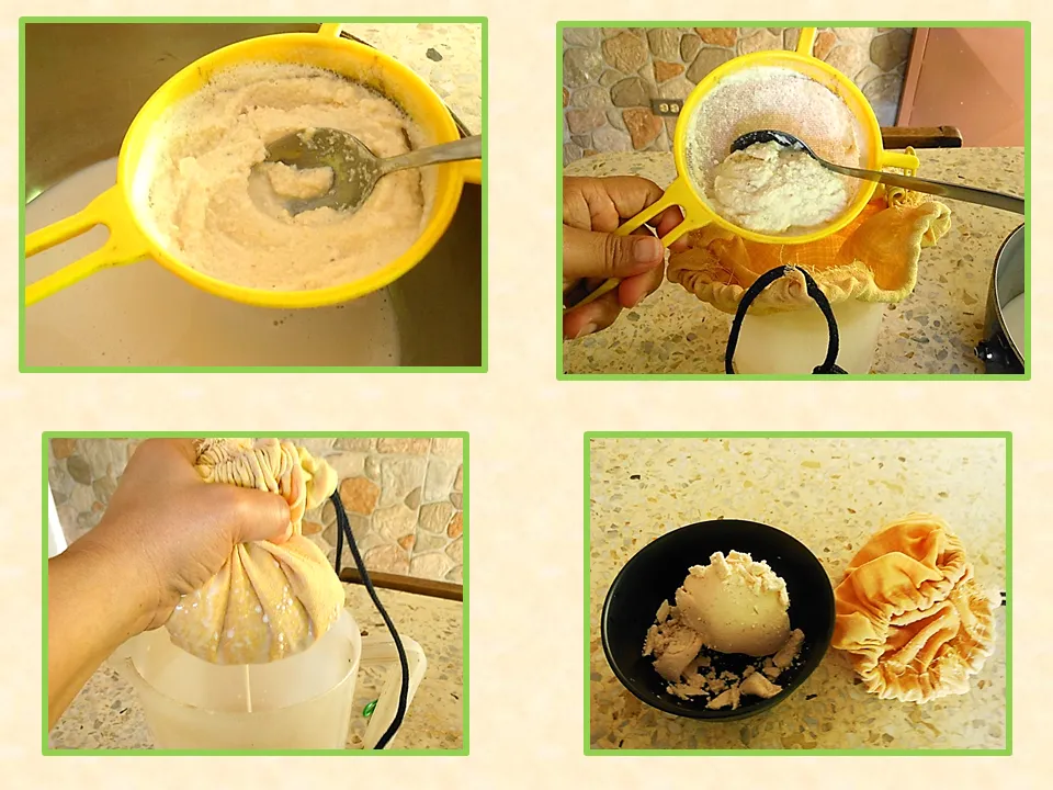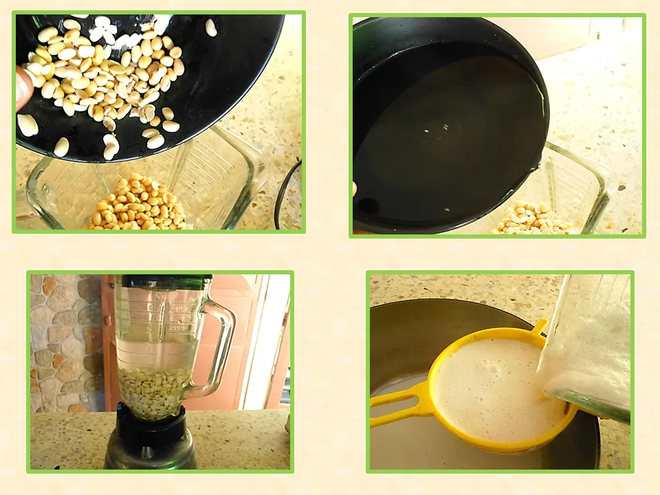 Los granos se colocan a hidratar con suficiente agua, durante toda la noche preferiblemente y pasado este tiempo se cuelan, les colocamos agua y los restregamos con el fin de que suelten la piel, la descartamos y colamos.