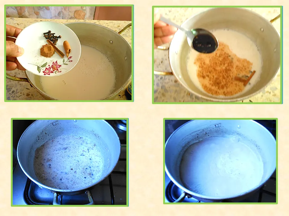 We put the milk in a pot, add the spices, finally the vanilla essence and leave it on the fire for 5 minutes since it starts to boil.