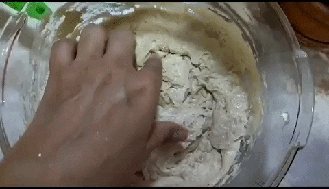 I mixed it with the help of a hand whisk. It turned out a soft and sticky dough, which I didn't knead.