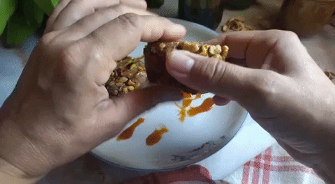 Roll the balls over the crushed nuts so that they are encrusted in the dough. Then place them in the molds and press down just a little on each ball with the back of the paddle to help them take shape.