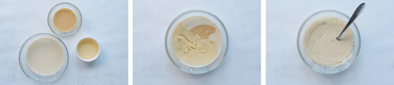 - In a separate bowl, mix the milk/vinegar mixture with the flaxseed 'egg' and oil (melted).