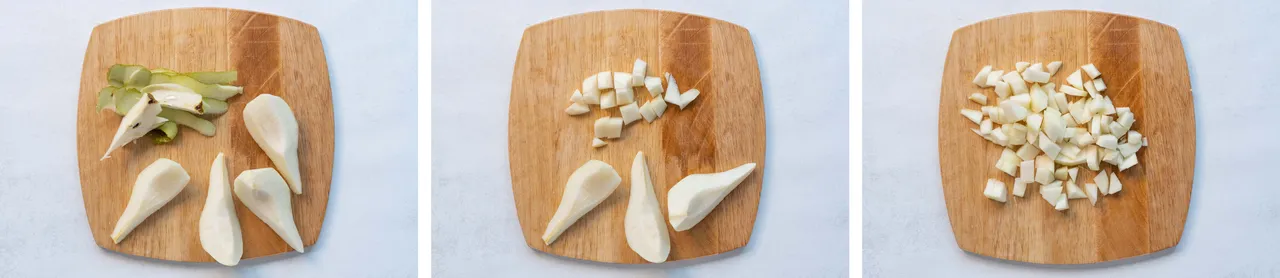 - Peel the pear, remove the seeds and chop into small cubes.
