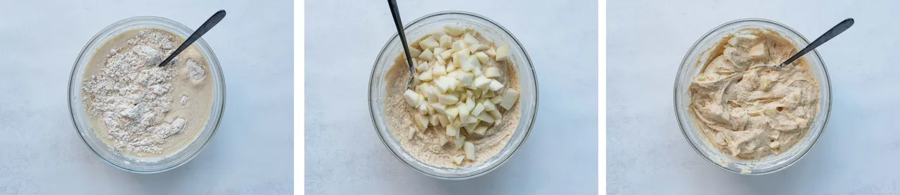 - Then mix the dry ingredients together with the wet. Stir in the chopped pear.
