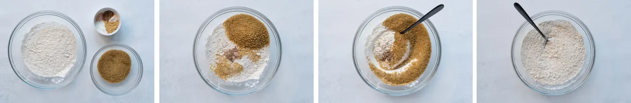 - Mix the flour, sugar, baking powder, baking soda, ginger, nutmeg and salt.