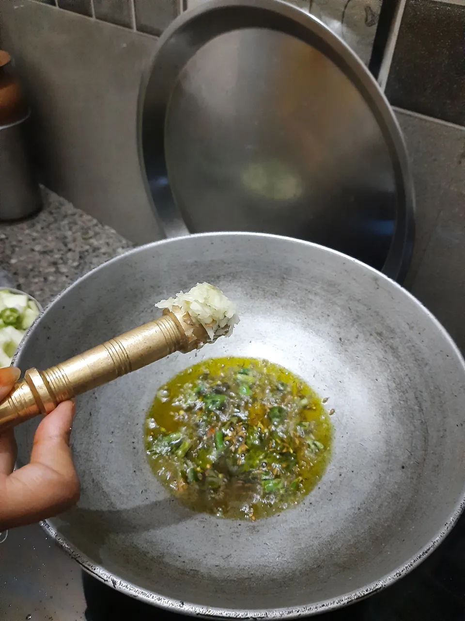4.take all the below ingredients and crushed the garlic pods in mortar pestle.