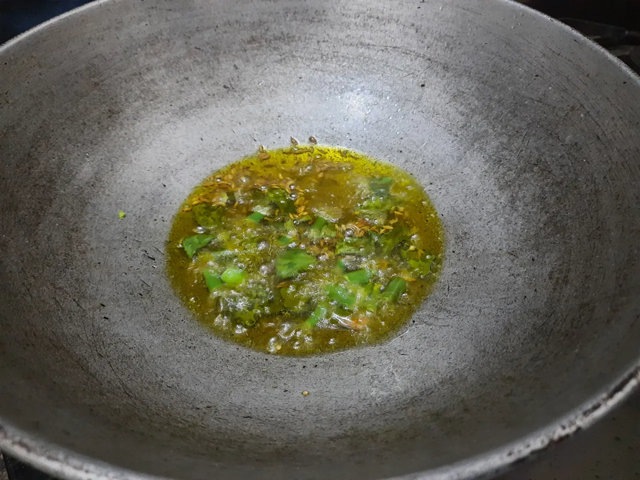 8.now add green chili and curry leaves.