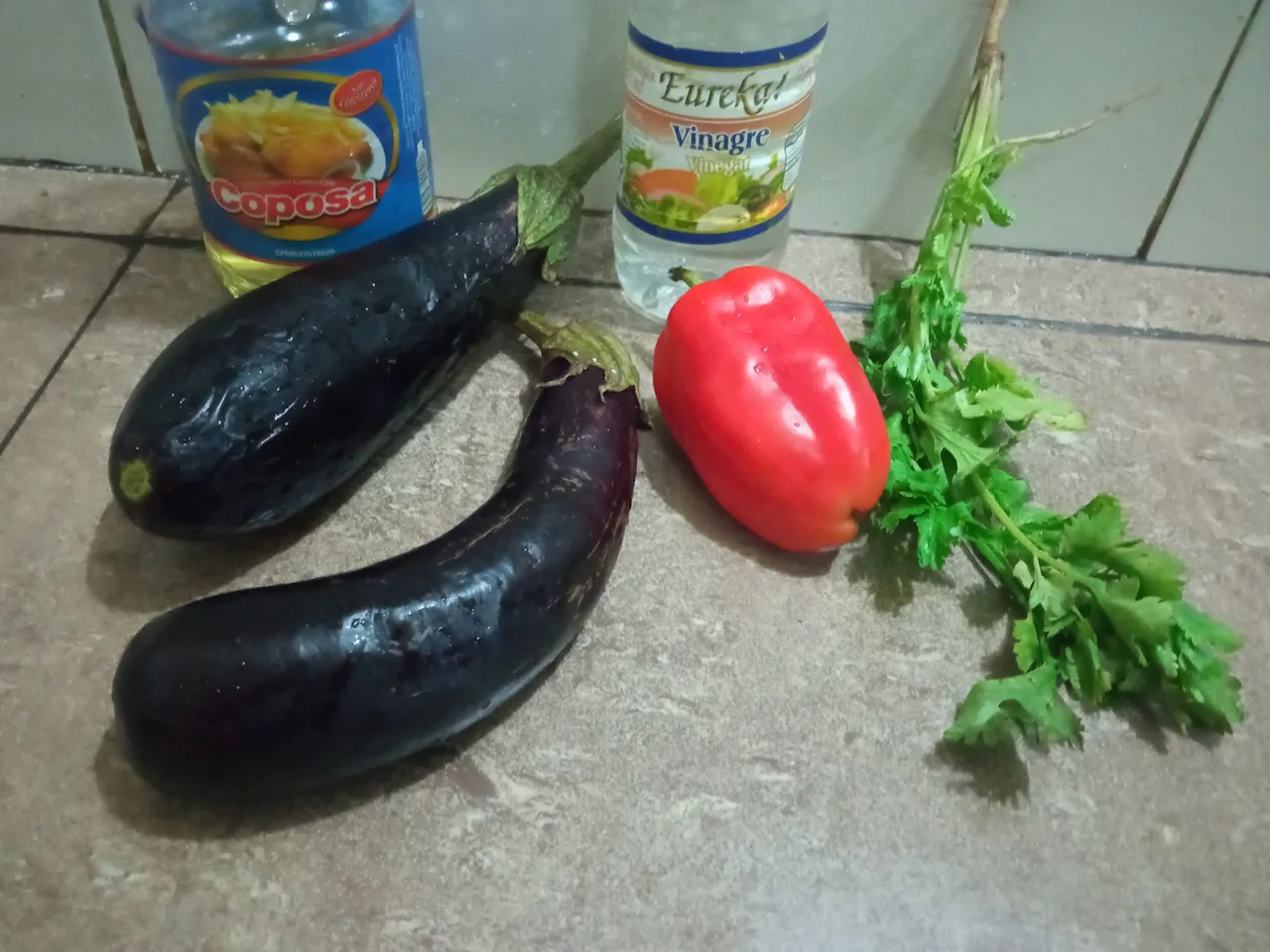 02 berenjenas, 01 pimentón, 01 puñado de cilantro, 1/2 taza de aceite, 01 cucharadda de vinagre, 01 ucharada de ajo en polvo, 01 cucharada de orégano, 01 cucharadita de azúcar, sal y pimienta al gusto || 02 eggplants, 01 paprika, 01 handful of coriander, 1/2 cup of oil, 01 tablespoon of vinegar, 01 tablespoon of garlic powder, 01 tablespoon of oregano, 01 teaspoon of sugar, salt and pepper to taste.