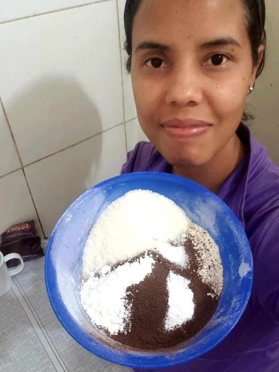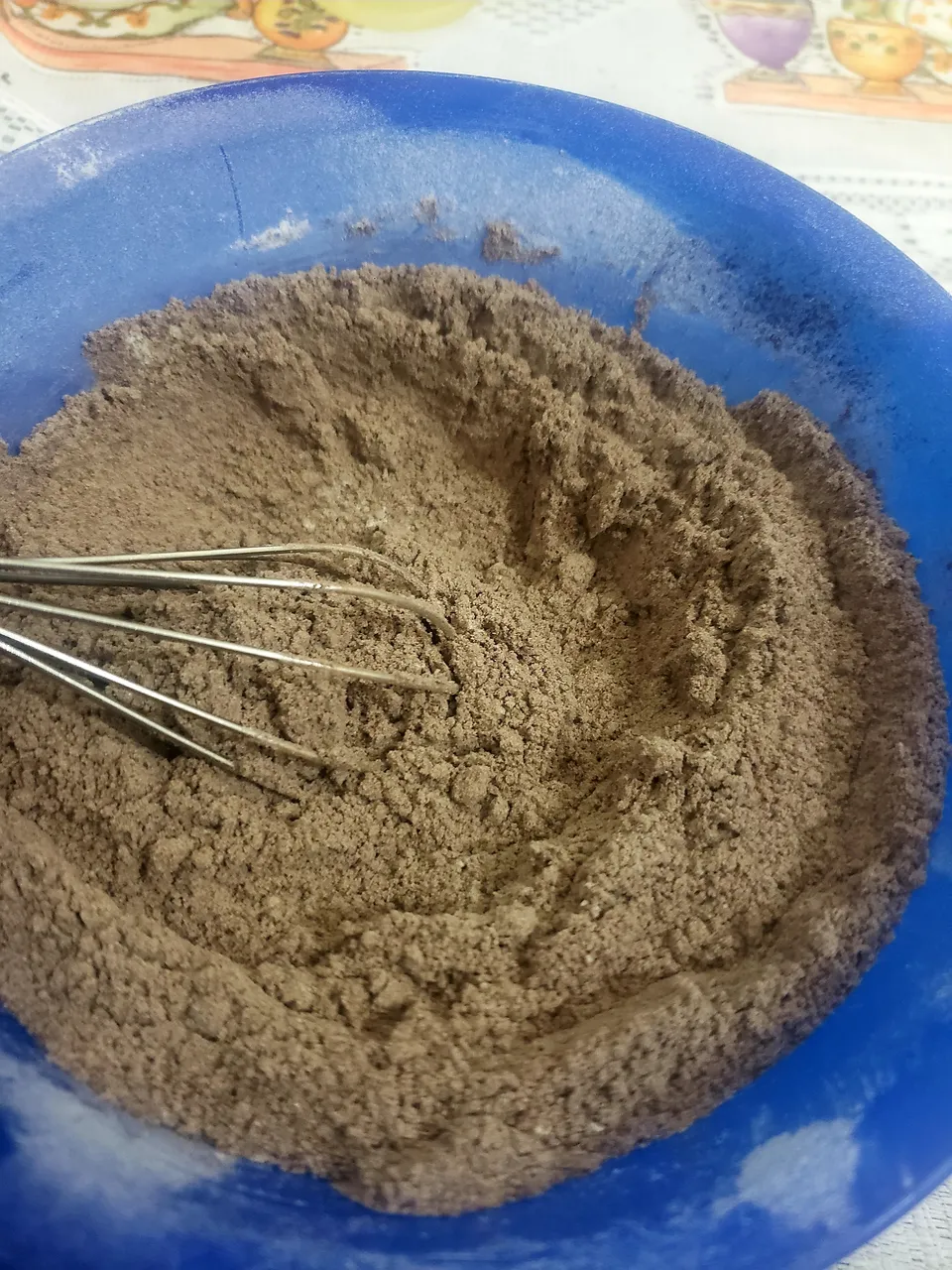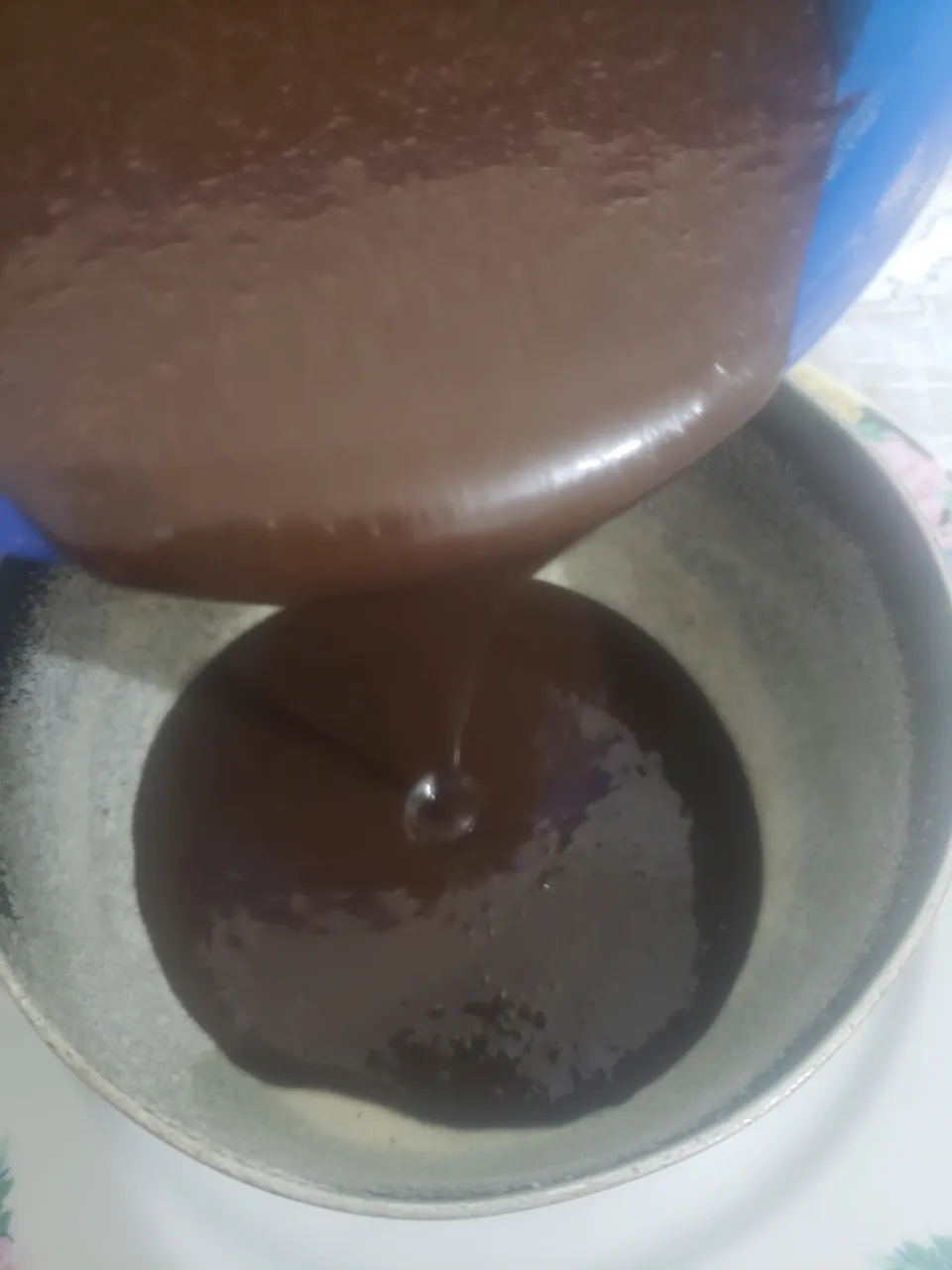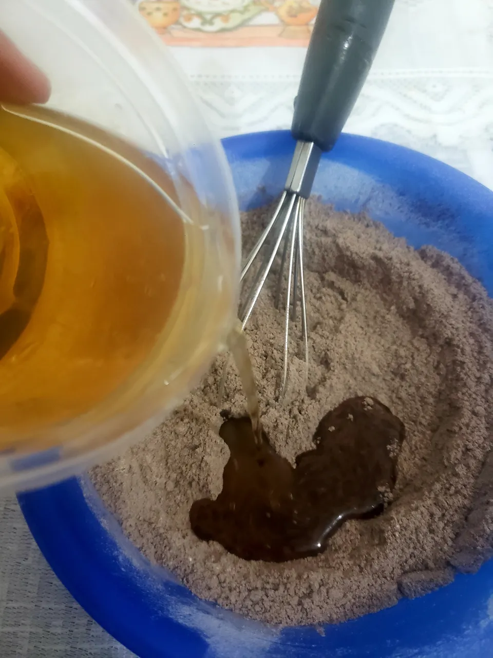 When I had mixed all the solids on one side and all the liquids on the other side, I proceeded to add the liquid mixture to the solid and beat manually until well integrated. The result was a preparation of little thickness, with quite a cocoa smell.
