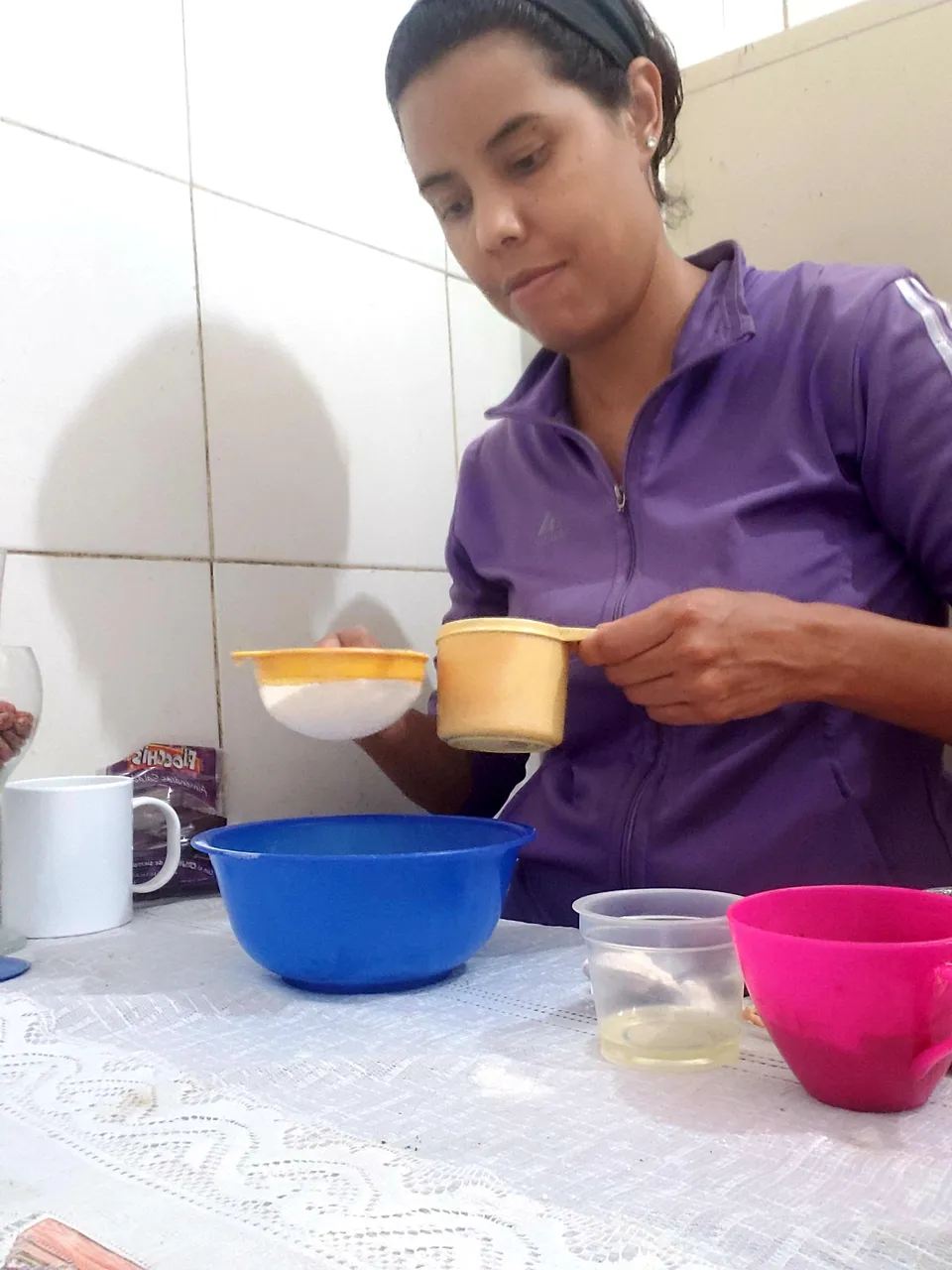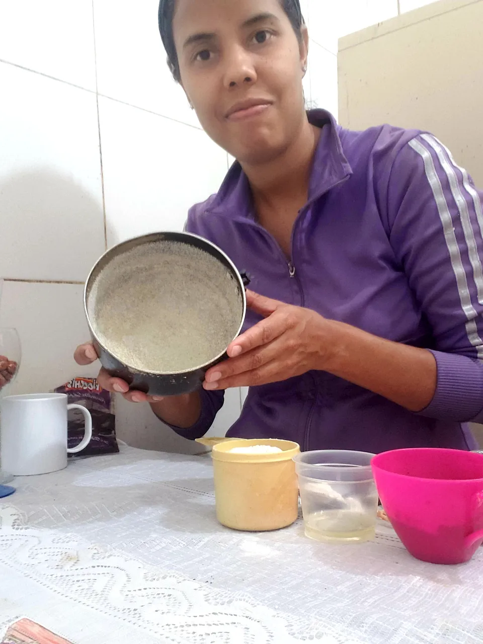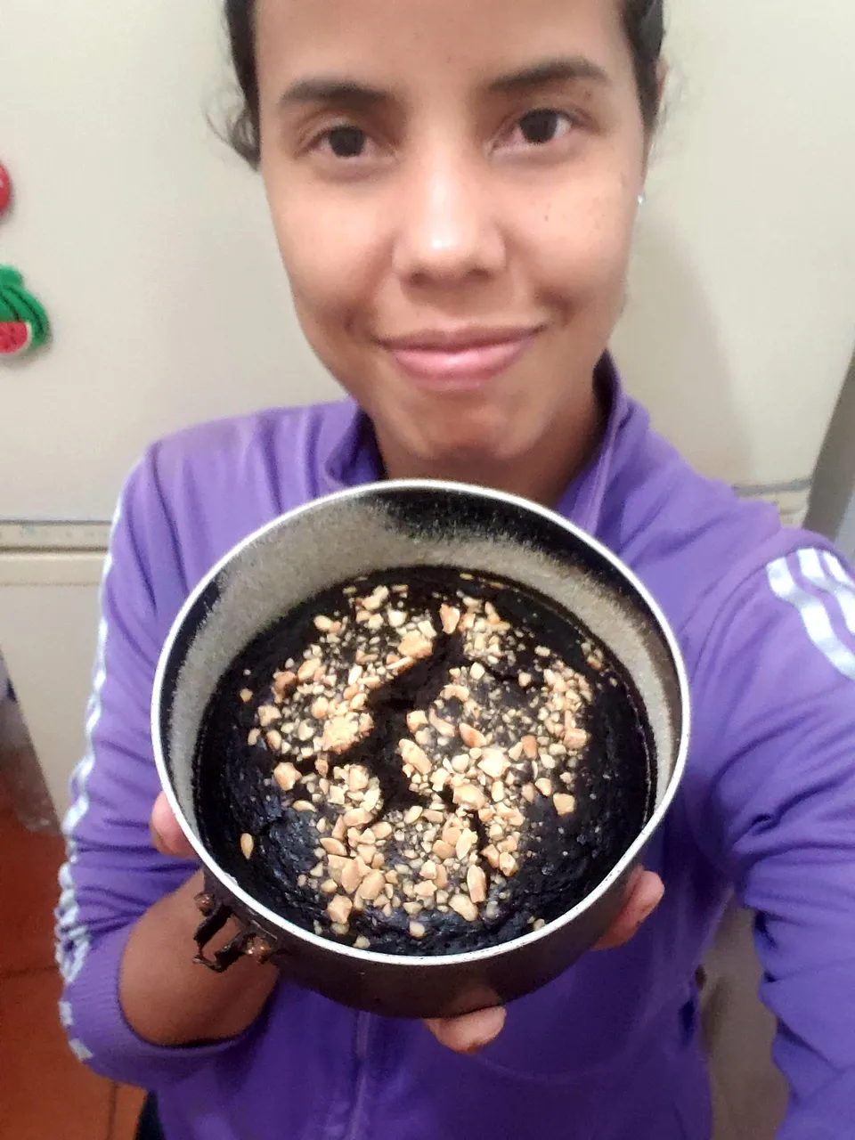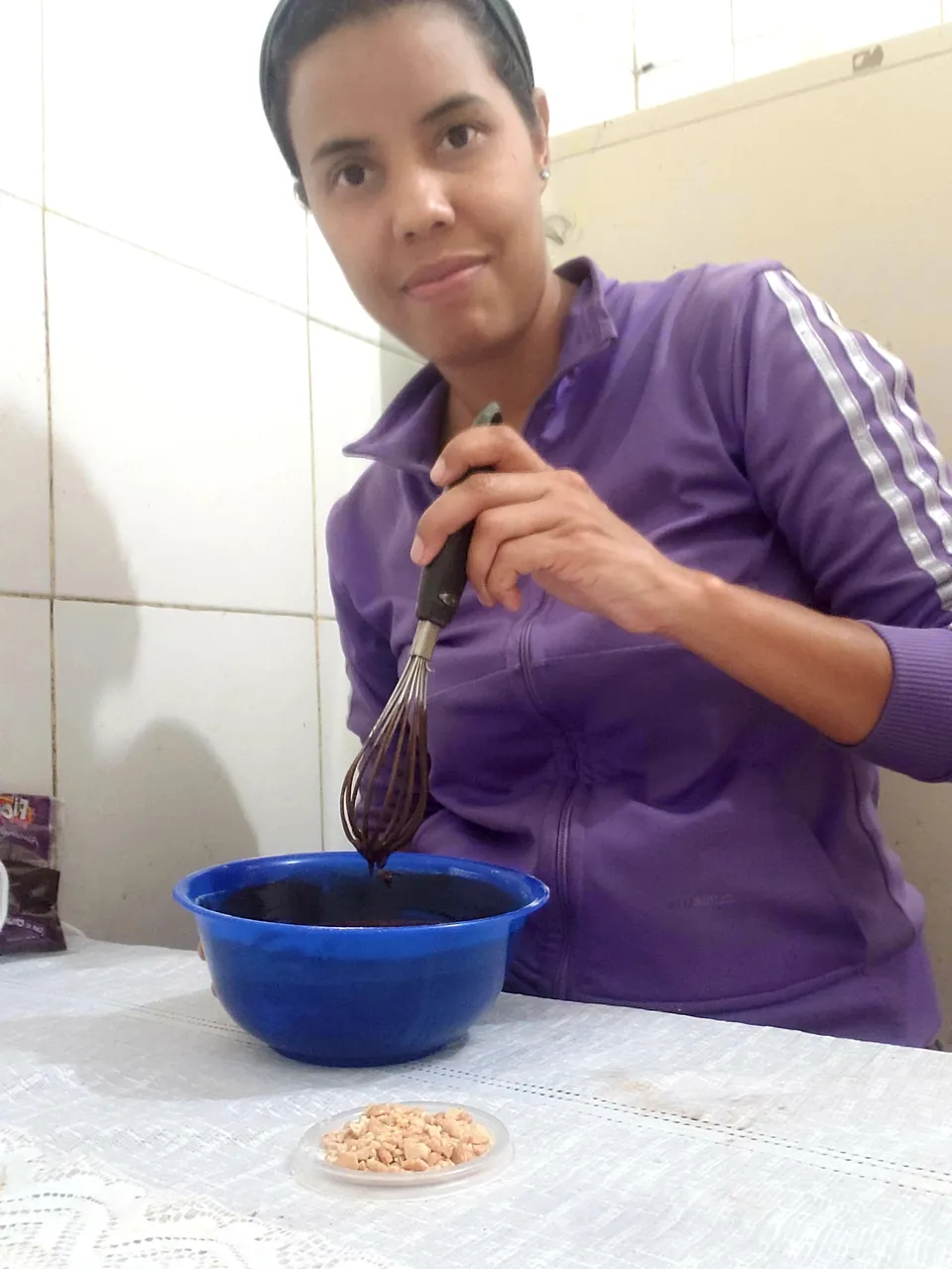 When I had mixed all the solids on one side and all the liquids on the other side, I proceeded to add the liquid mixture to the solid and beat manually until well integrated. The result was a preparation of little thickness, with quite a cocoa smell.