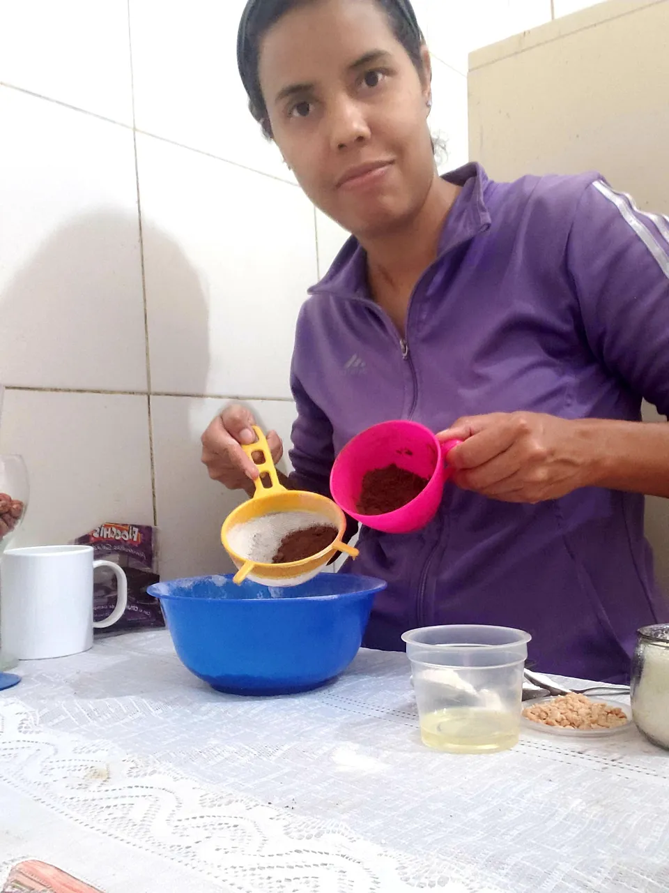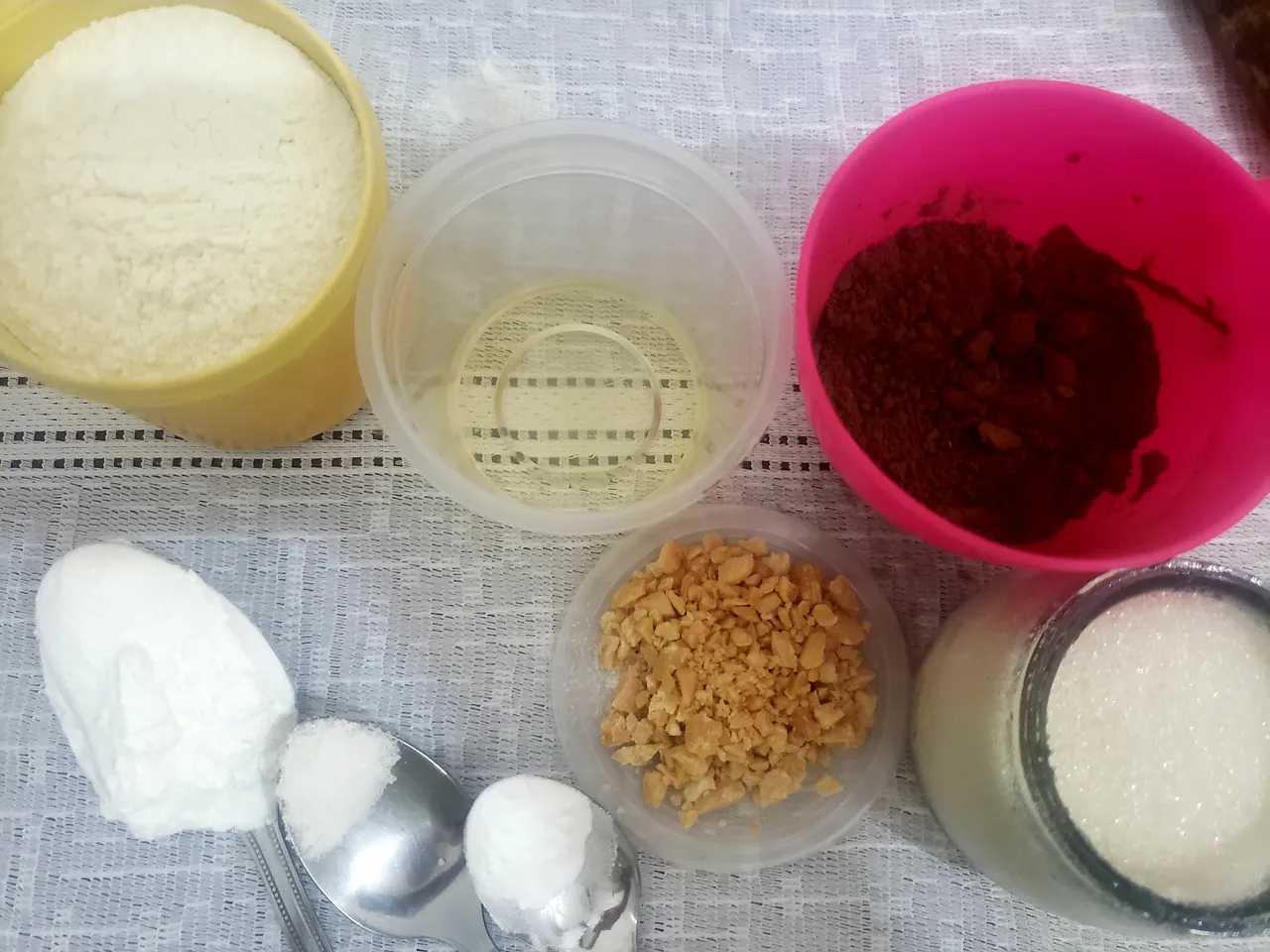 Then, I proceeded to beat the cake mixture, which I did in a very simple way. I sifted the flour and cocoa and mixed them together with the rest of the solid ingredients, except for the peanuts. I set aside.