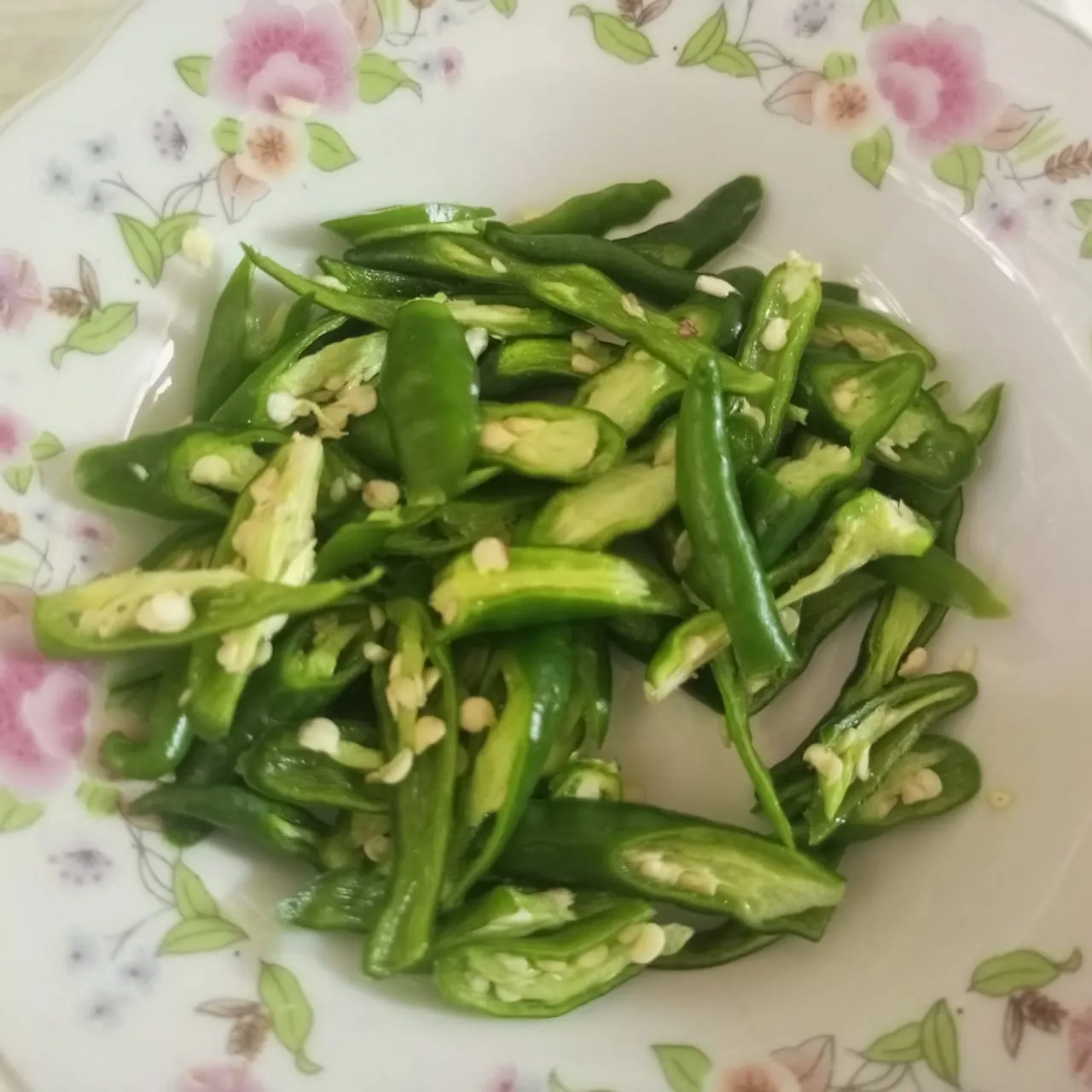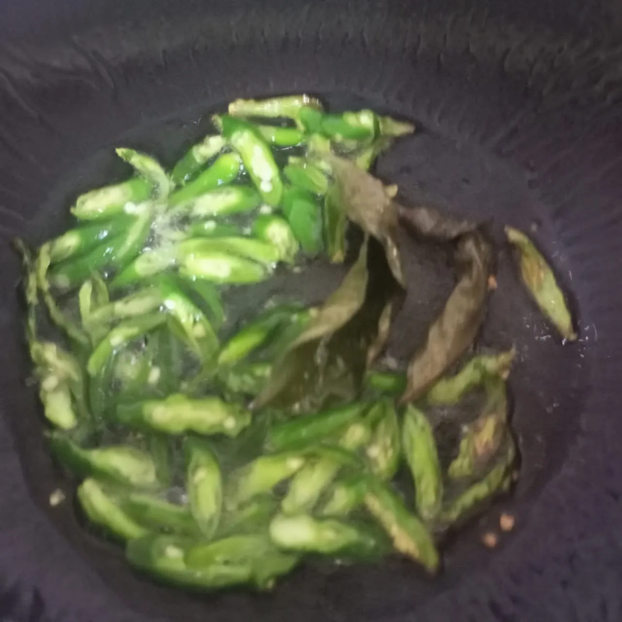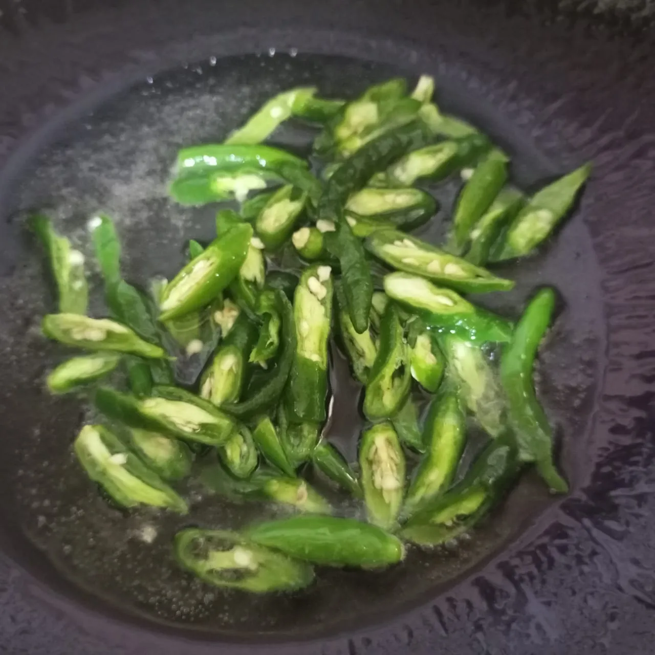🔻Heat the oil, add the green chilies which have been washed and thinly sliced.