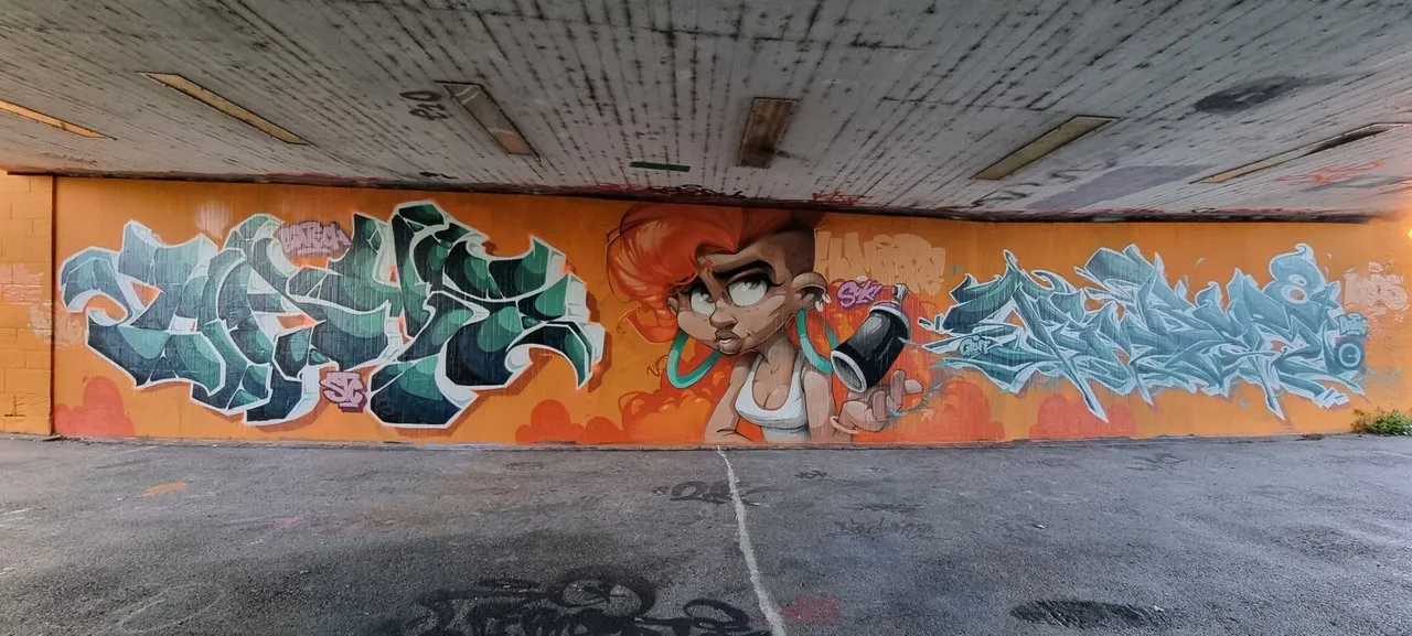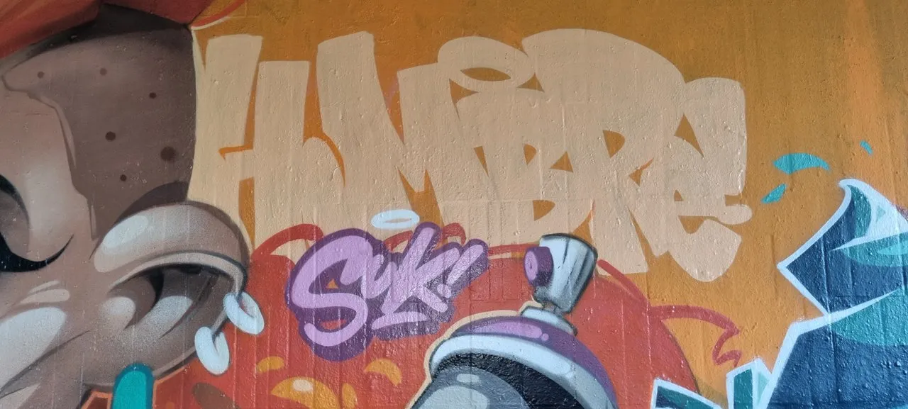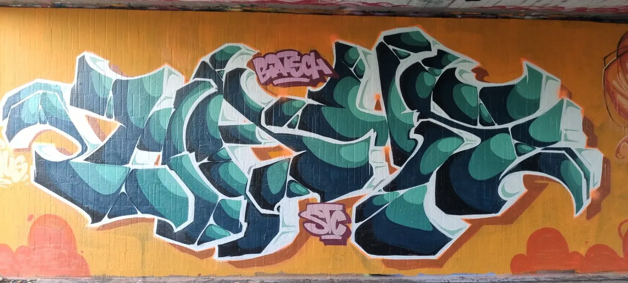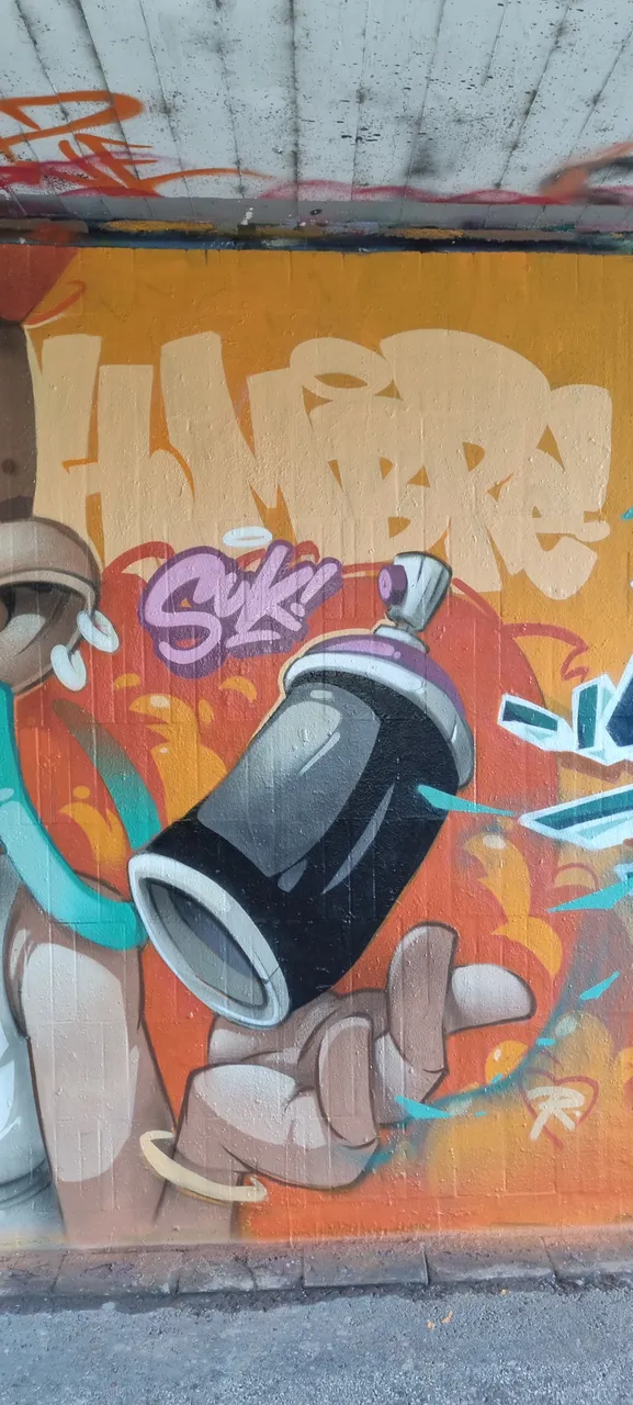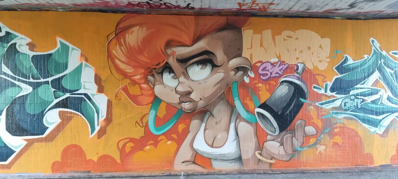 Hombre SUK ist zurück! Pablo Fontagnier alias " Hombre SUK " gebohren in Mannheim und wohnt in Nürnberg. Beim letzten Graffiti Jam ( einmal im Jahr treffen sich einige Graffiti Künstler und Künstlerin in Mannheim, jeder bekommt eine Stelle zu geteilt um dort ein Graffiti zu erstellen innerhalb am einen Tag ) war Hombre SUK in Mannheimer Graffiti Park und erstellte dieses Graffiti. Unverkennbar ist sein Amerikanisches Anime Comic / Graffiti stil zu die Charakter / Figur, eine Frau die ganz logger ist und eine Spraydose leicht hüpfen lässt. Zwei auffälligen Schriften in Türkis Farben und ein paar Schriften in dezender Farben die im Hintergrundfrabe verschwinden. So erkennt man sofort seinen stil. Wie findet ihr sein Graffiti, der innerhalb am einen Tag enstanden ist?