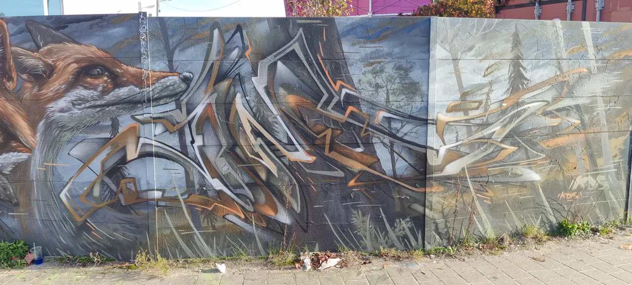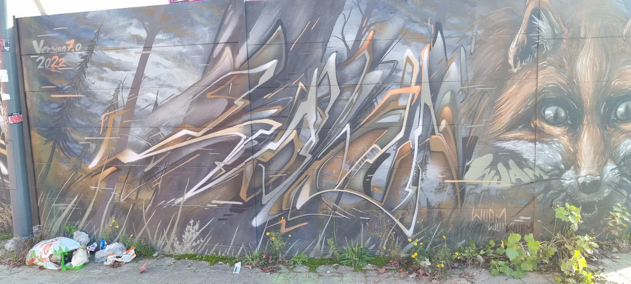 Am Samstag hat es mich nach Karlsruhe verschlagen, nicht wegen Graffiti sondern wegen der Karlsruher Herbstmesse ( Kirmes ) um dort die Fahrgeschäfte zu Filmen für meinen Youtube Kanal. Am Parkplatz an gekommen sah ich genau am Messplatz dieses Graffit und dachte mir " Wau, ok das muss ich doch Fotografieren " . Ein Karlsruher Graffiti Künstler Namen " WUAM - WorldNeedColors " ( Homepage: https://wuam.jimdofree.com/w%C3%A4nde-2022/ ) hat diese beide schöne Füchse gesprayt. Zwei Füchse auf die Jagd, der eine Fuchs mit einem Starren Blick auf die Strasse mit einer Maus in dem Mund und der andere Fuchs hält ausschau nach neue Beute. Die farben wurden Herbstlich gehalten, eher in dünklere töne. Leider kann ich nicht entzieffern was links und rechts neber die Füchse geschrieben wurde. Gersprayt wurde 2022 und ist seine Version 7.0 . Auf seine Homepage sieht man das er im diesem Jahr bis jetzt 15 Graffitis gemacht hat. Mit diesem Tier Graffiti bewerbe ich mich zum CCC's Street Art Contest #116