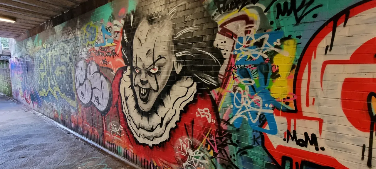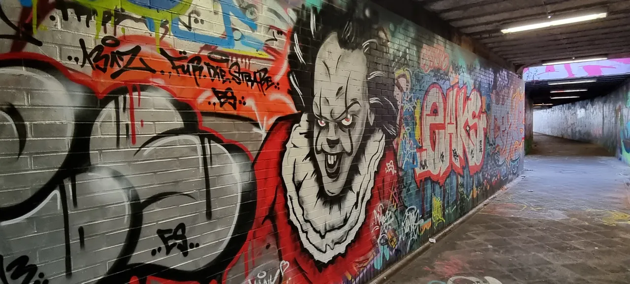 Unter einer Eisenbahn unterführung schlummert Pennywise, bekannt vom Stephen King E.S. .Eigentlich fühlt sich Pennywise im Kanal wohl, aber auch hier unter der Eisenbahnführung auch. Künstler / Künstlerin leider unbekannt, jedoch passt dieses Graffiti hier im Untergrund super.