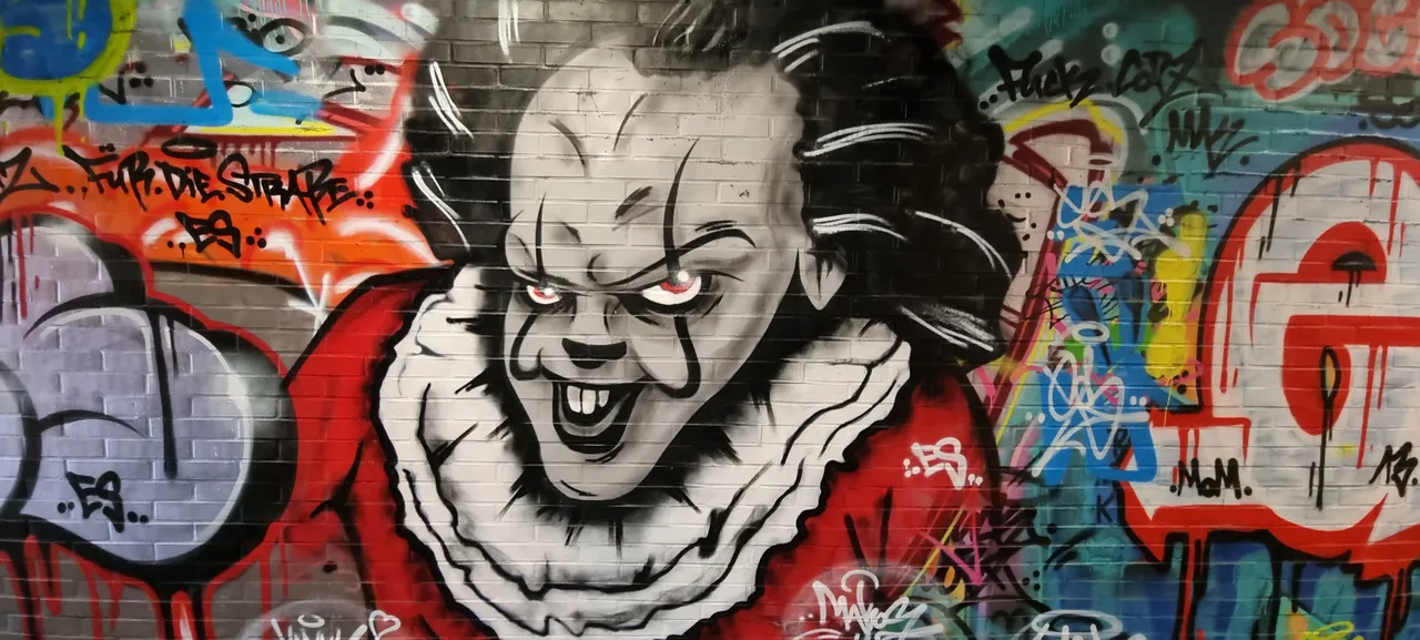 Under a railroad underpass slumbers Pennywise, known from Stephen King E.S. .Actually, Pennywise feels comfortable in the canal, but also here under the railroad guide also. Artist / artist unfortunately unknown, but fits this graffiti here in the underground super.