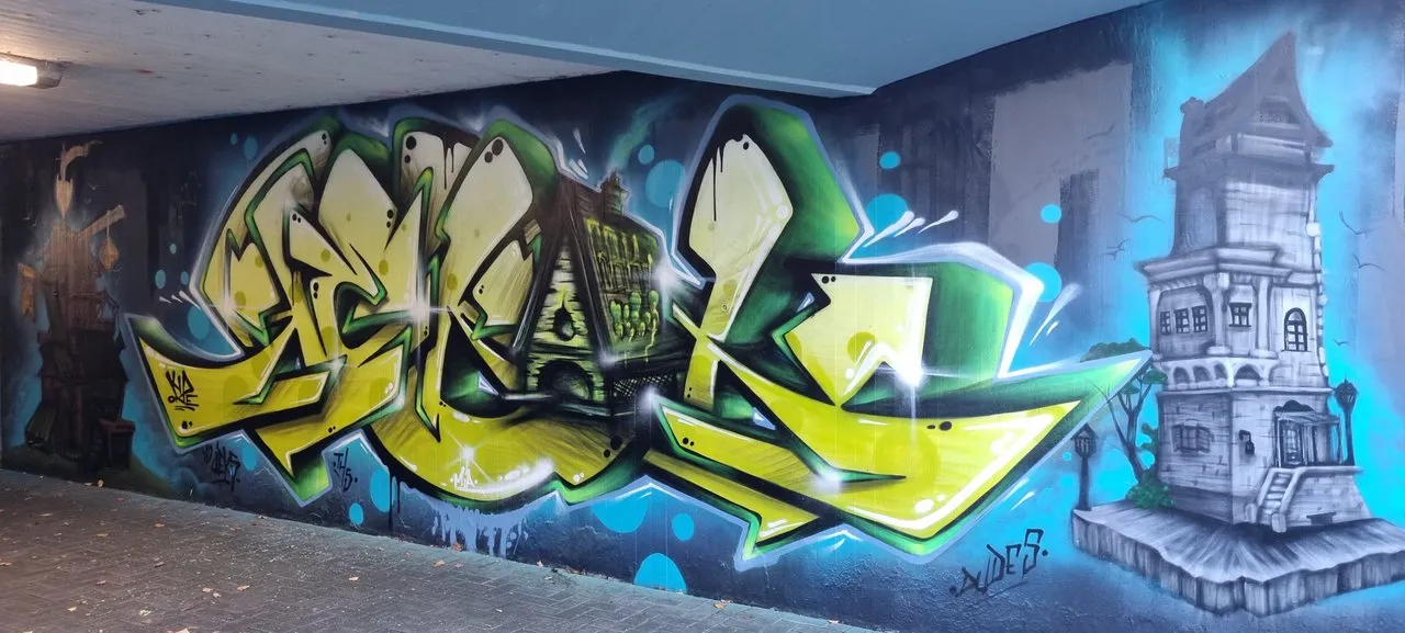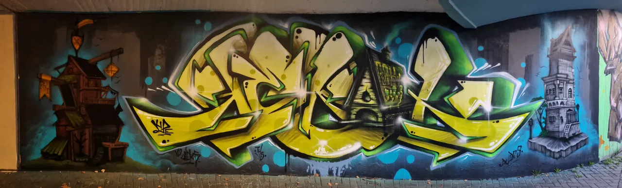 Von meiner letzten Ludwigshafen Tour am BASF Tor 12 war dieses Graffiti. Als erstes fällt natürlich die Gelbe Schrift mit giftgrünen Umrandung auf mit einen kleinen Haus dazwischen das es eigentlich als " O " sein soll, hier steht geschrieben " Rebok " ein merkmal für andere Graffitis die ich hier auf Hive schon gepostet habe. Links ist ein hohes Holzhaus und rechts eins aus Stein. Dieses Graffiti hat der Künstler " Kidone " gesprayt. Hintergrund in Schwarz gehalten und die Gebäude und Schrift mit Türkis / Blau hinterlegt.