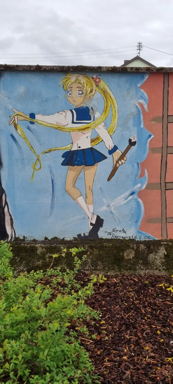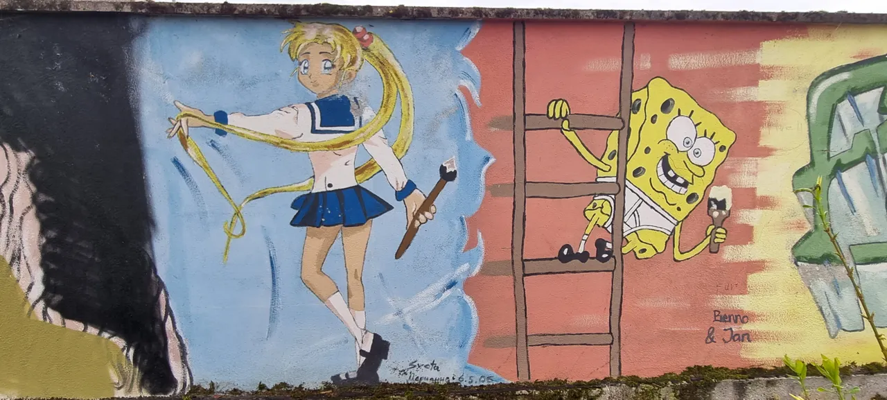 Am einen Kinderspielplatz befinden sich diese beide bracht exemplare. Auf der linke seite sieht Usagi Tsukino ( Spitzname Bunny ) von den Anime Serie " Sailor Moon " und auf der rechten Seite Spongebob Schwammkopf. Die beiden stehen hier seit 2005 und die Maler und Malerin steht unter die Figur.