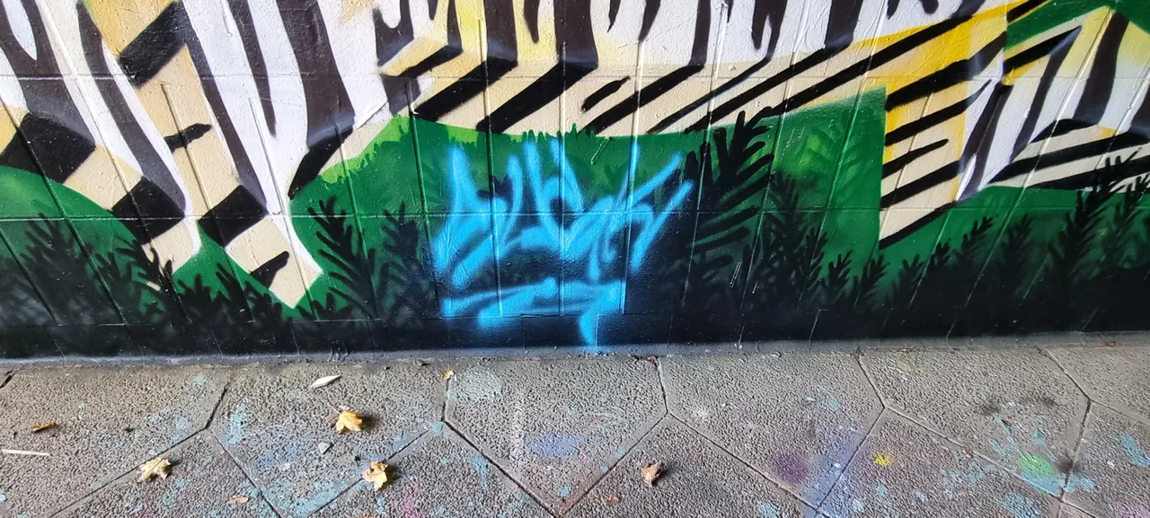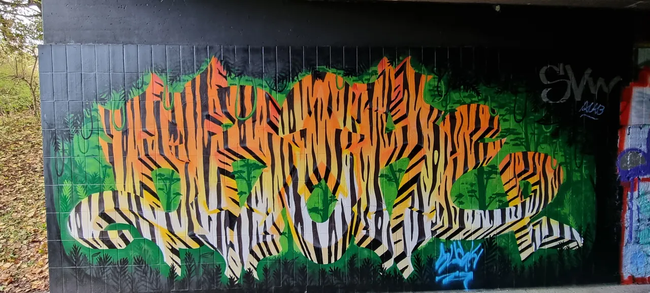 In Mannheim unter einer kleine Brücke im Graffiti Park befindet sich dieses kleine Graffiti. Dieses Graffiti ist im einen Dschungel untermalt und die Hauptschrift im Tiger Muster das sie gut zu geltung kommt. Eins finde ich doch leider nicht so gelungen, er oder sie hätte die schrift mit einem Rahmen um malen müssen, das man auch lesen kann was da steht. Leider wurde dieses Graffiti schon von halbstarken leuten verschmiert, oben rechts vom SVW ( Fussball Verein Waldhof ) und eine blaue schriftzug was ich aber nicht denke das es die unterschrift des Künstler / Künstlerin ist.