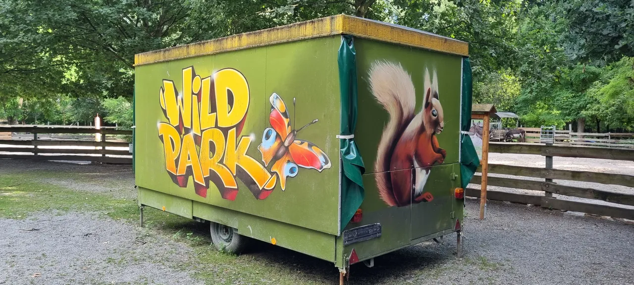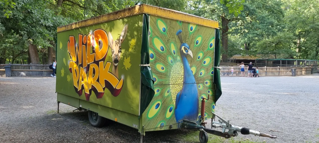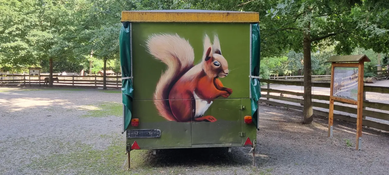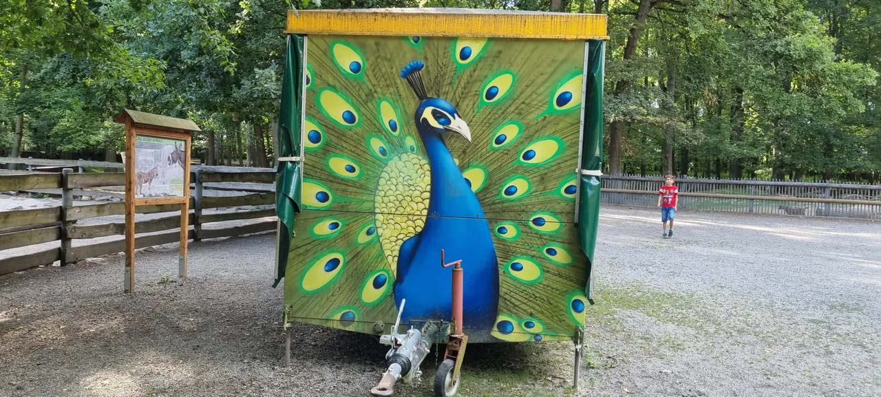 In a small game park near Ludwigshafen in the Pfalz is this small trailer with beautiful animal motifs. On it were sprayed wild animals that you can meet in the wild such as the squirrel, fawn, butterfly and the peacock. But also other animals can be seen in this wild park that were not sprayed on this trailer on it, such as the lynx, the wild cat that is slowly increasing again with us in Germany to see.