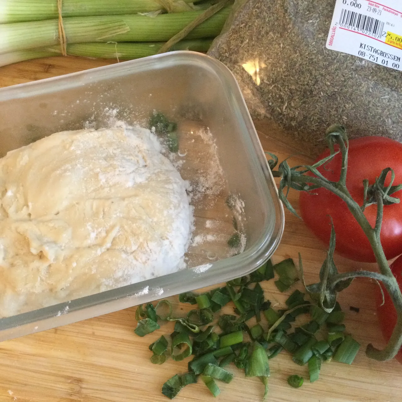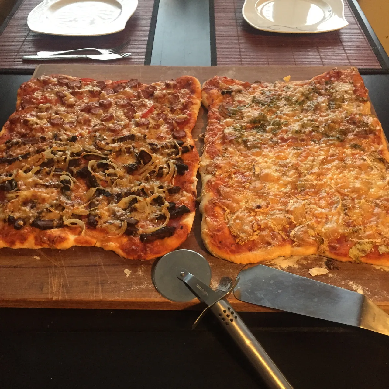 There's still time before the dough is ready, so use it to prepare the toppings. Anything you have in your fridge is good. Thinly sliced carrots and leek? Maybe some leftover porkchops with mushrooms? Diced salami and bell pepper? Napa cabbage and slices of brie? Perhaps a dollop spoonful of bolognese with spiralized aubergine? Or like we do it here since the dough is enough for four whole baking sheets, if rolled out thin enough - four different kinds of pizza in one go!