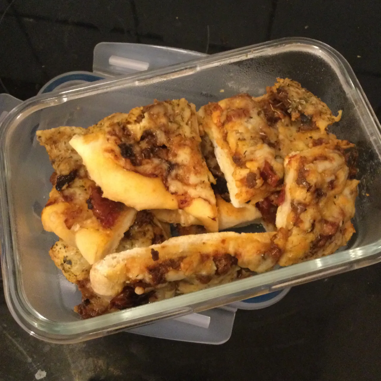 Unfortunately I got to know about it just about when we ate the last slice of the pizza we cooked last night, and it'll be a week or more before we have the same dish again so... the only current picture is of my husband's lunch box. Bite-size pieces. The rest are older.