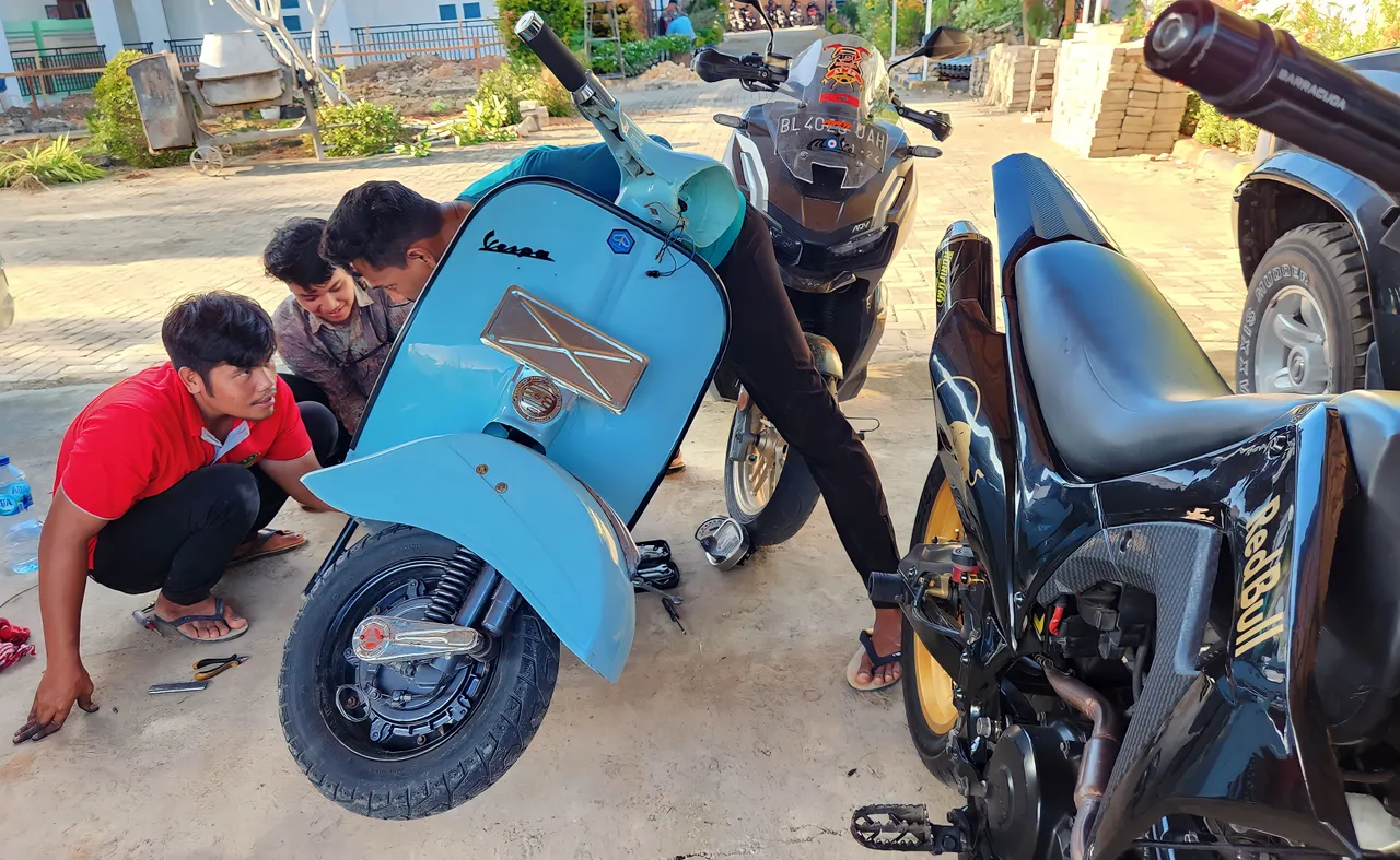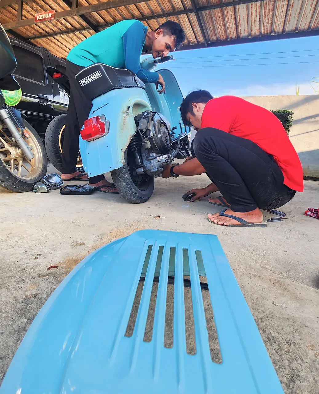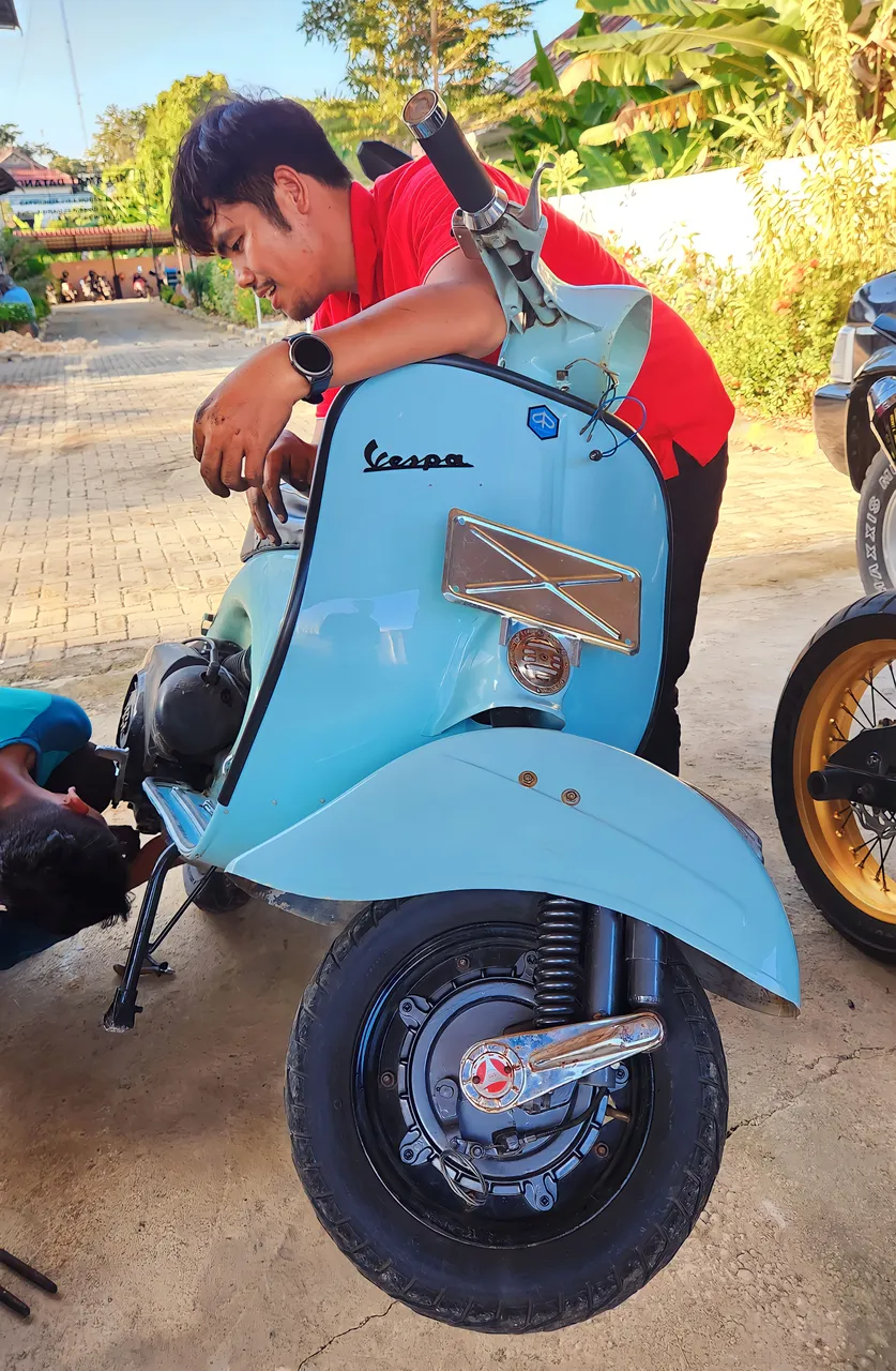 This afternoon, my brother's antique Vespa couldn't be turned on again, and several of his Vespa community friends came to help fix it. My little brother looked like he was about to give up when his Vespa immediately stopped for a moment when it was about to move when it was about to be put in forward gear.