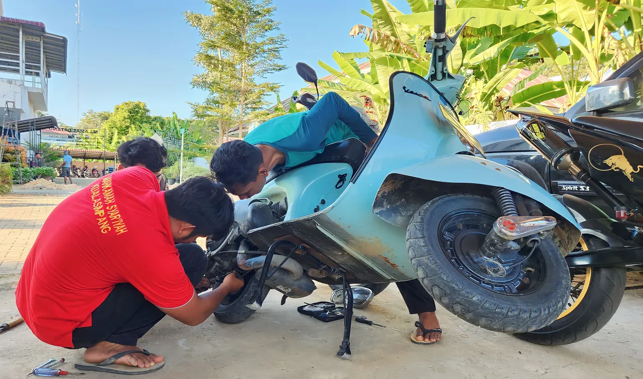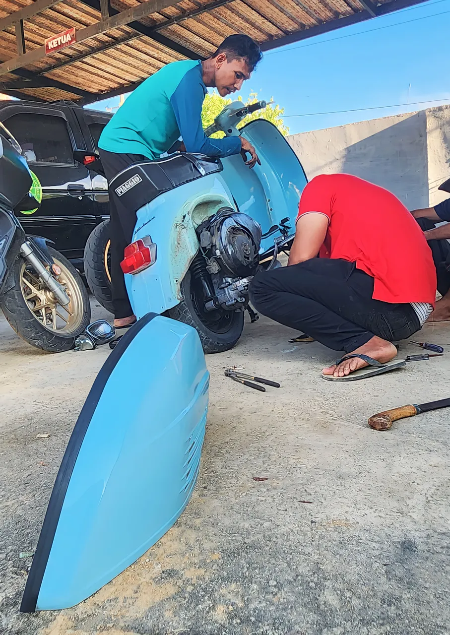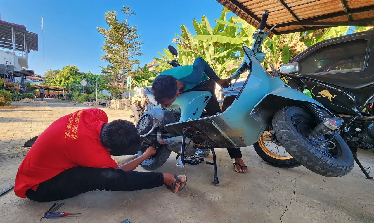 This afternoon, my brother's antique Vespa couldn't be turned on again, and several of his Vespa community friends came to help fix it. My little brother looked like he was about to give up when his Vespa immediately stopped for a moment when it was about to move when it was about to be put in forward gear.
