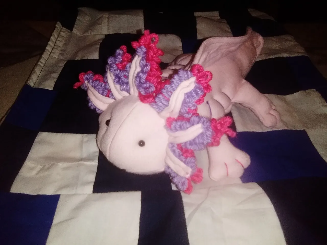 Entre estas criaturas vi una salamandra marina que me pareció interesante. A mí no me gusta este tipo de animal pero al mirar sus colores me resultó hermosa. Mi idea fue plasmarla como un peluche para mí bebé, ya que ella no está en edad para jugar con otros juguetes.