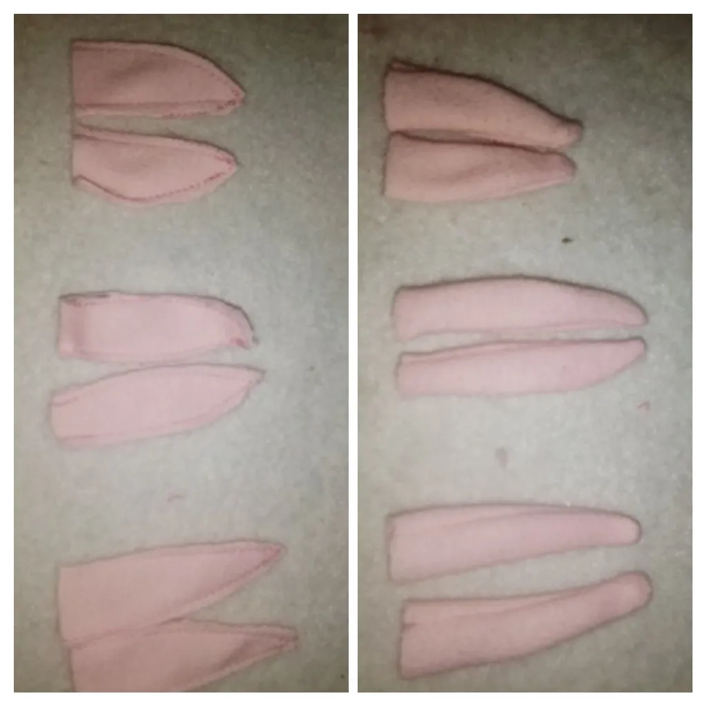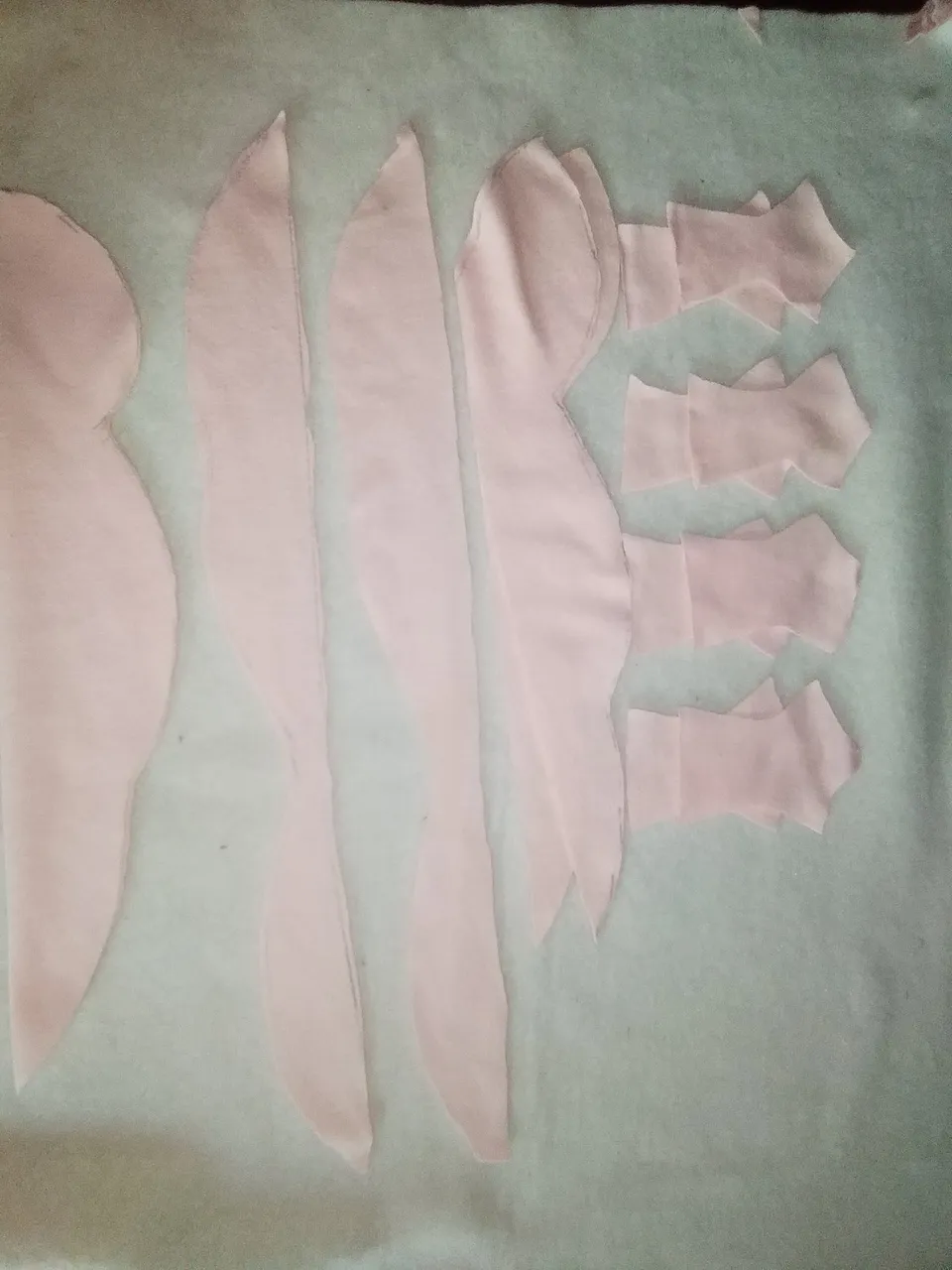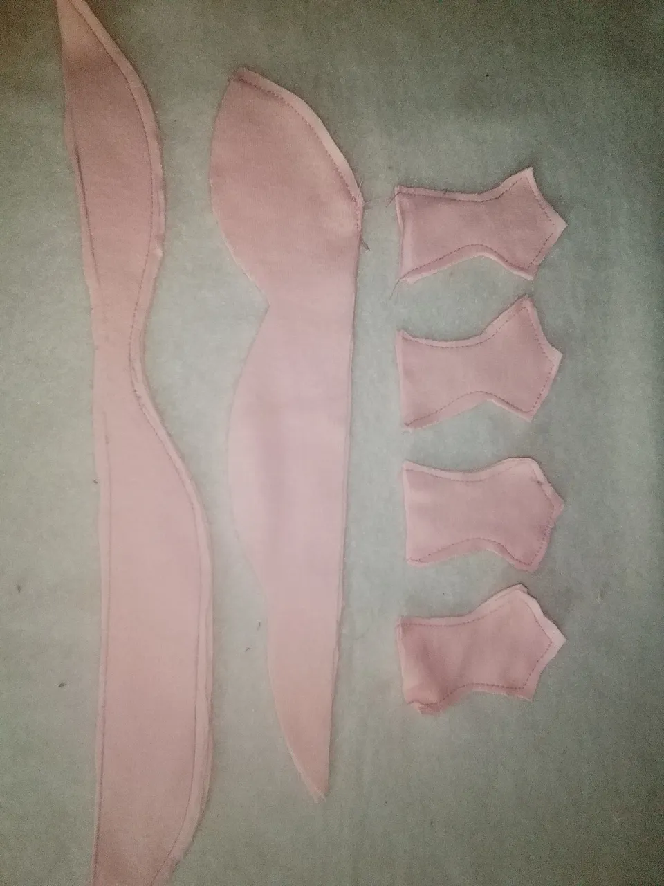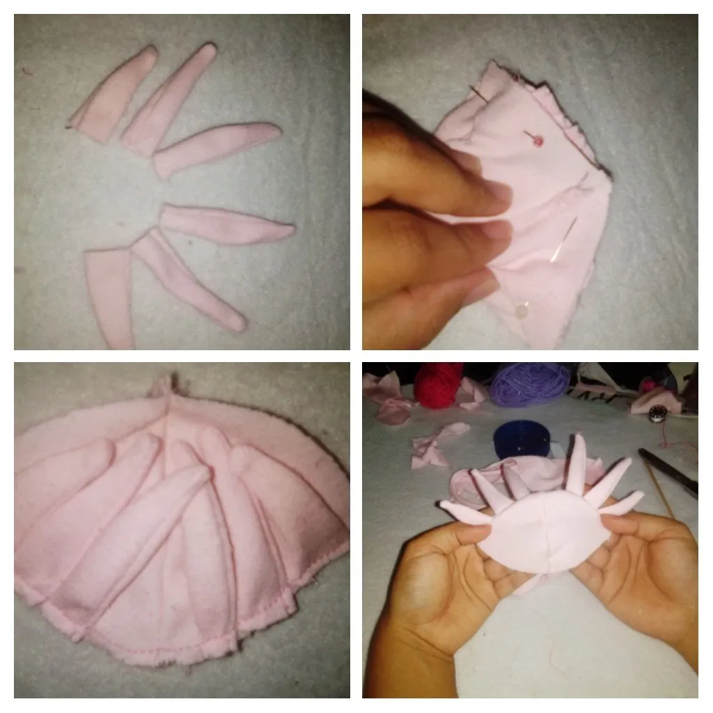 We will make the gills that will go on the head, these should have 3 different sizes. We sew on the edge and flip over.