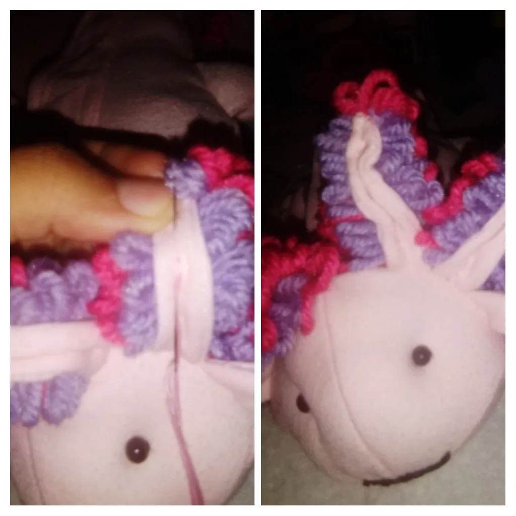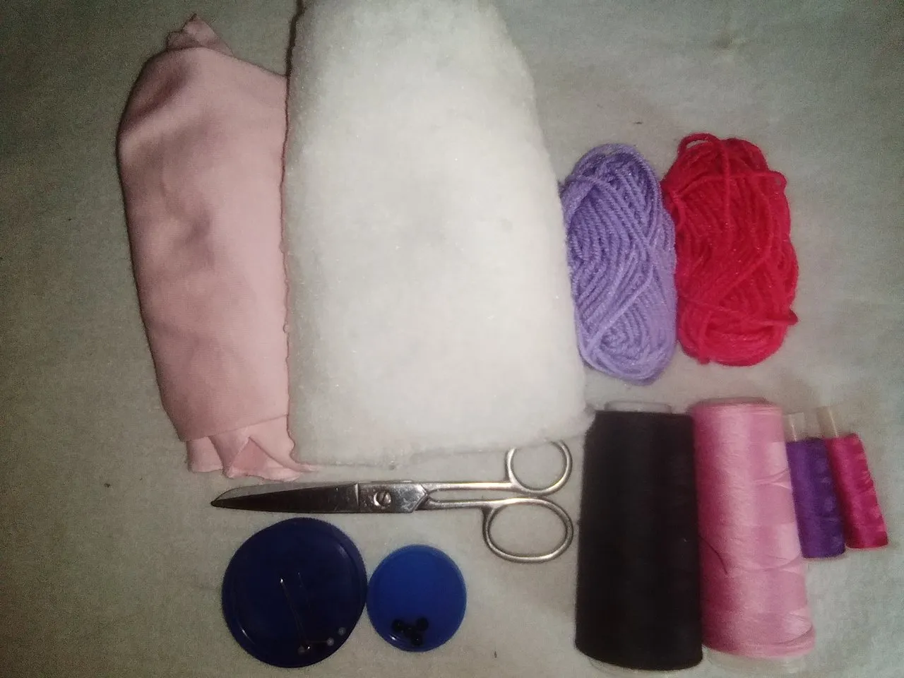 We will make the most colorful part with the yarn. We will sew very well placing a purple layer and then a fuchsia one. We will also make the gills on the sides with purple thread.