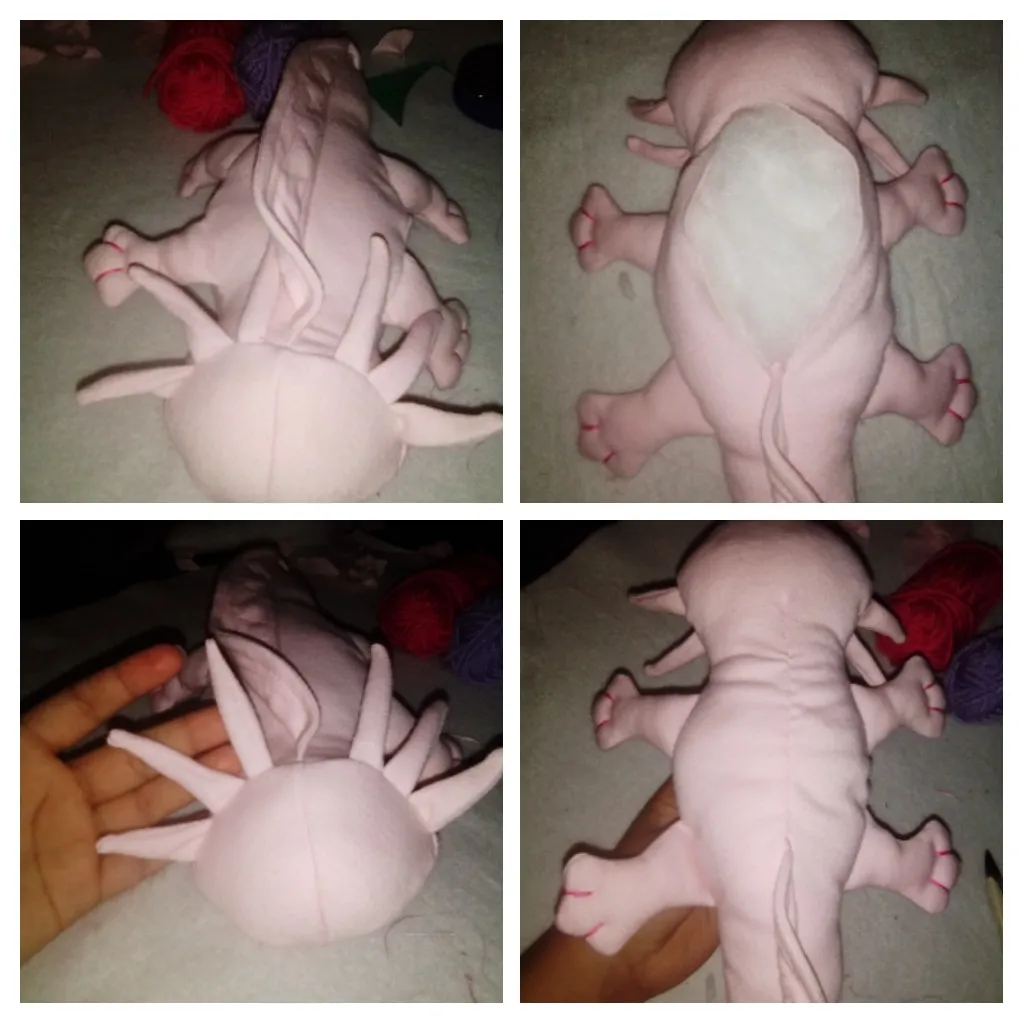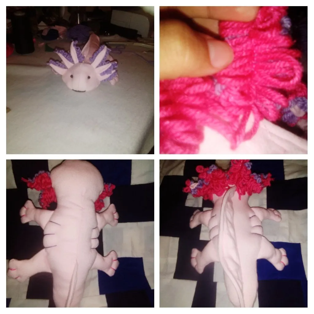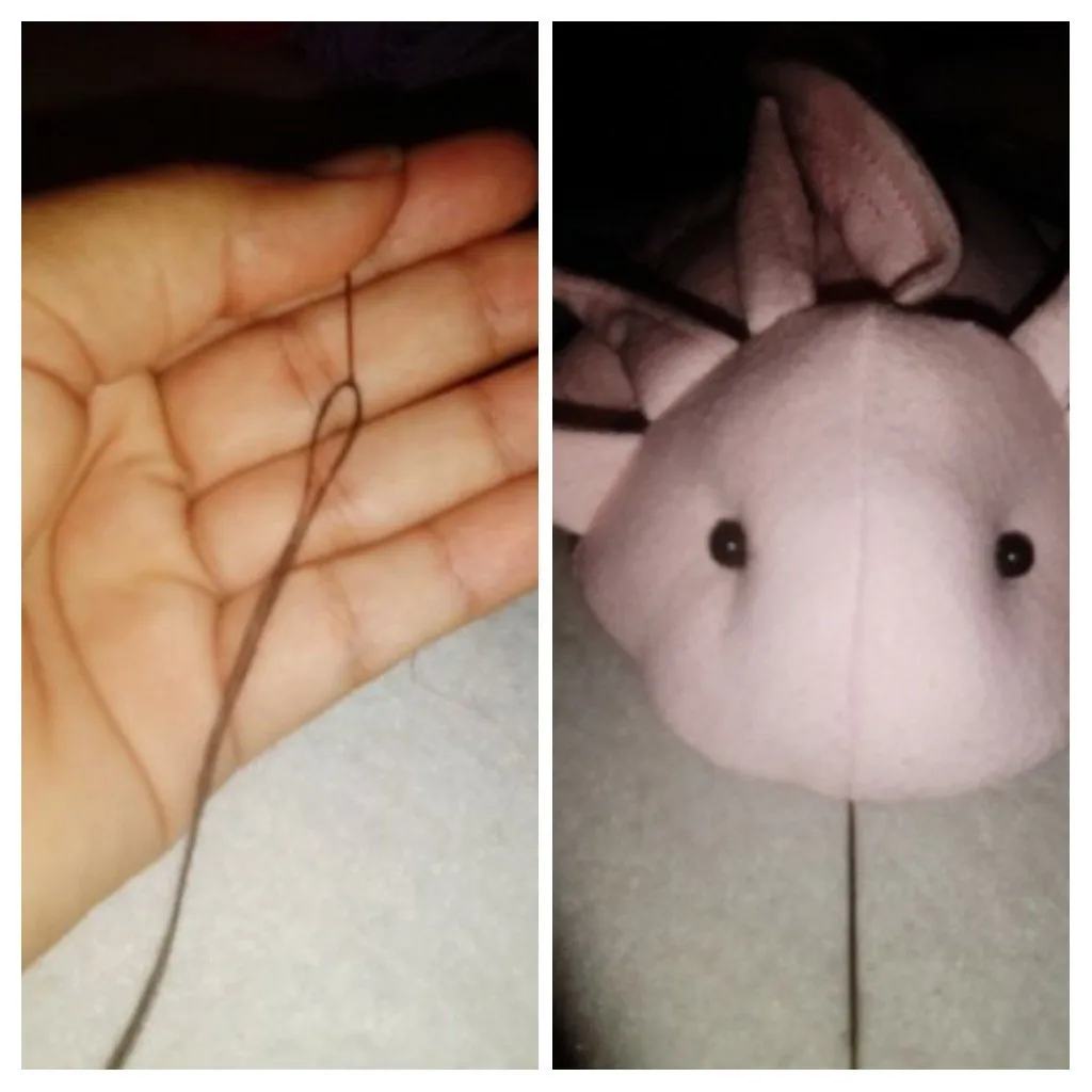 Aseguraremos bien el estambre cosiendo las branquias de la cabeza desde el frente con hilo rosa claro de está manera también daremos más rigidez. Con esto terminamos la salamandra de peluche.