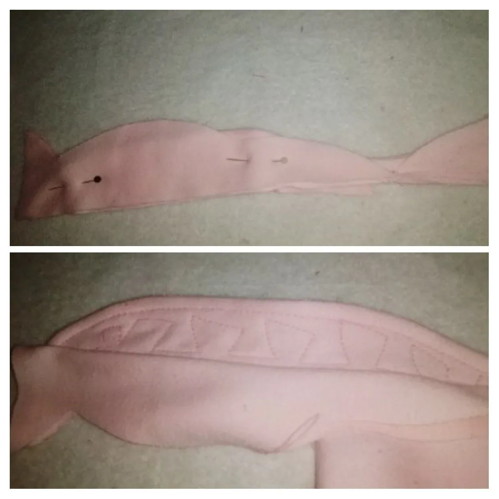 We sew along the edge the legs, the dorsal fin and the top of the head.