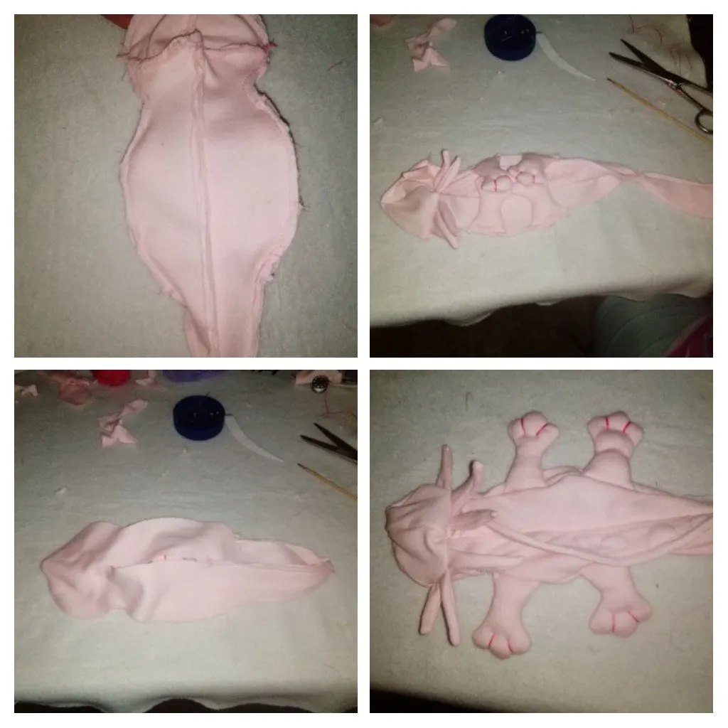 Colocamos las patitas y unimos la parte de arriba con la parte de la barriga. Debemos rematar muy bien donde iran las patitas así aseguramos la costura, daremos vuelta por la abertura de la barriga.