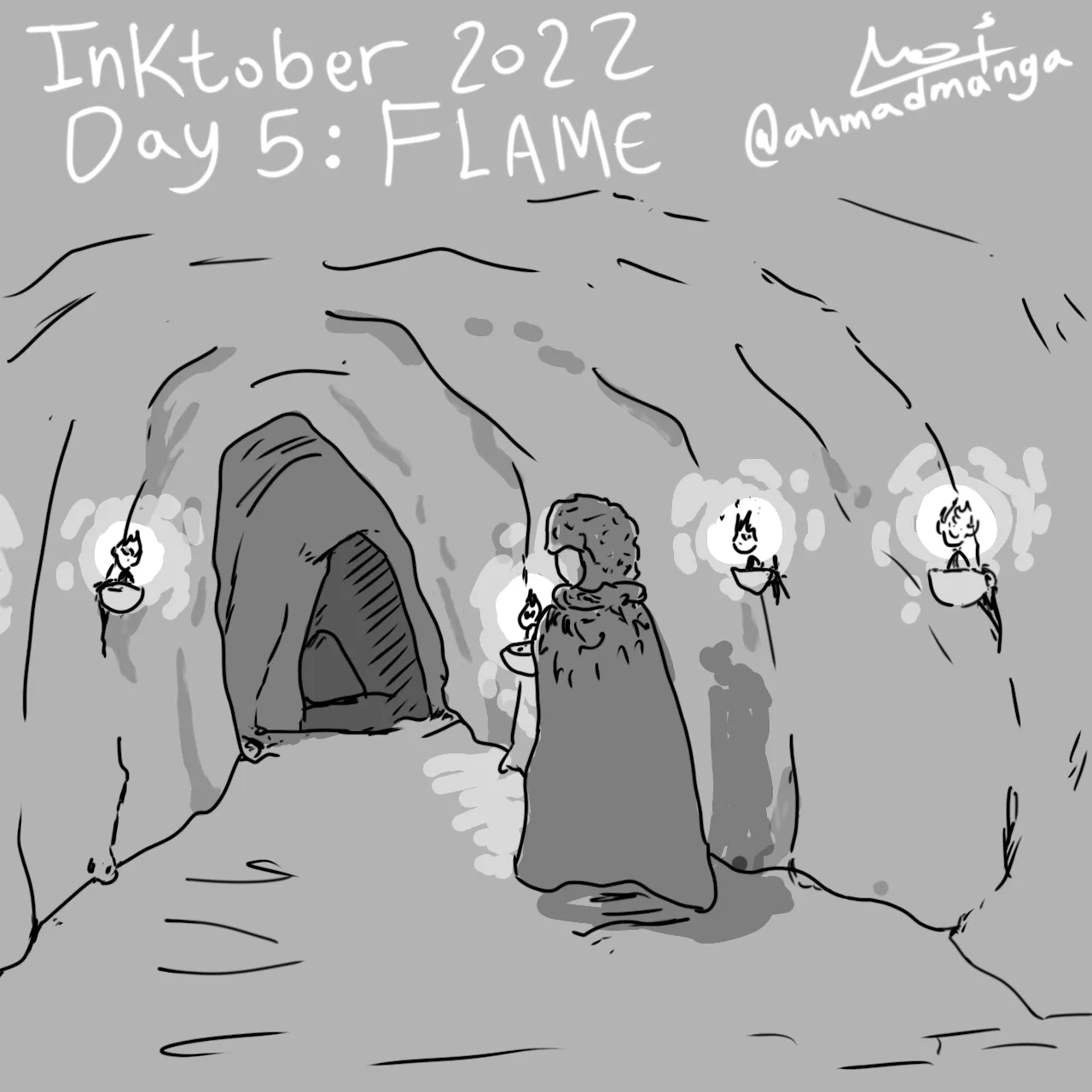 Can't believe I came up with this idea from the prompt Flame: A man uses (fire) candles to light his way in a cave.