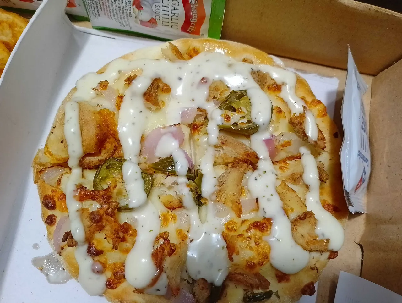 As we were two people hence medium pizza is good to enjoy. It was not only yummy but also tasty due to the taste of chicken tikka. Each slice with soft bread was easily digestible. It took three minutes to finish it with chilly sauce.