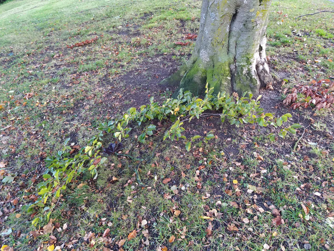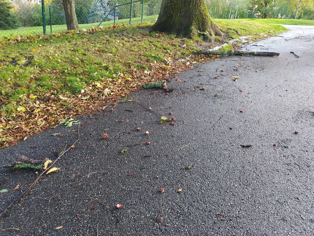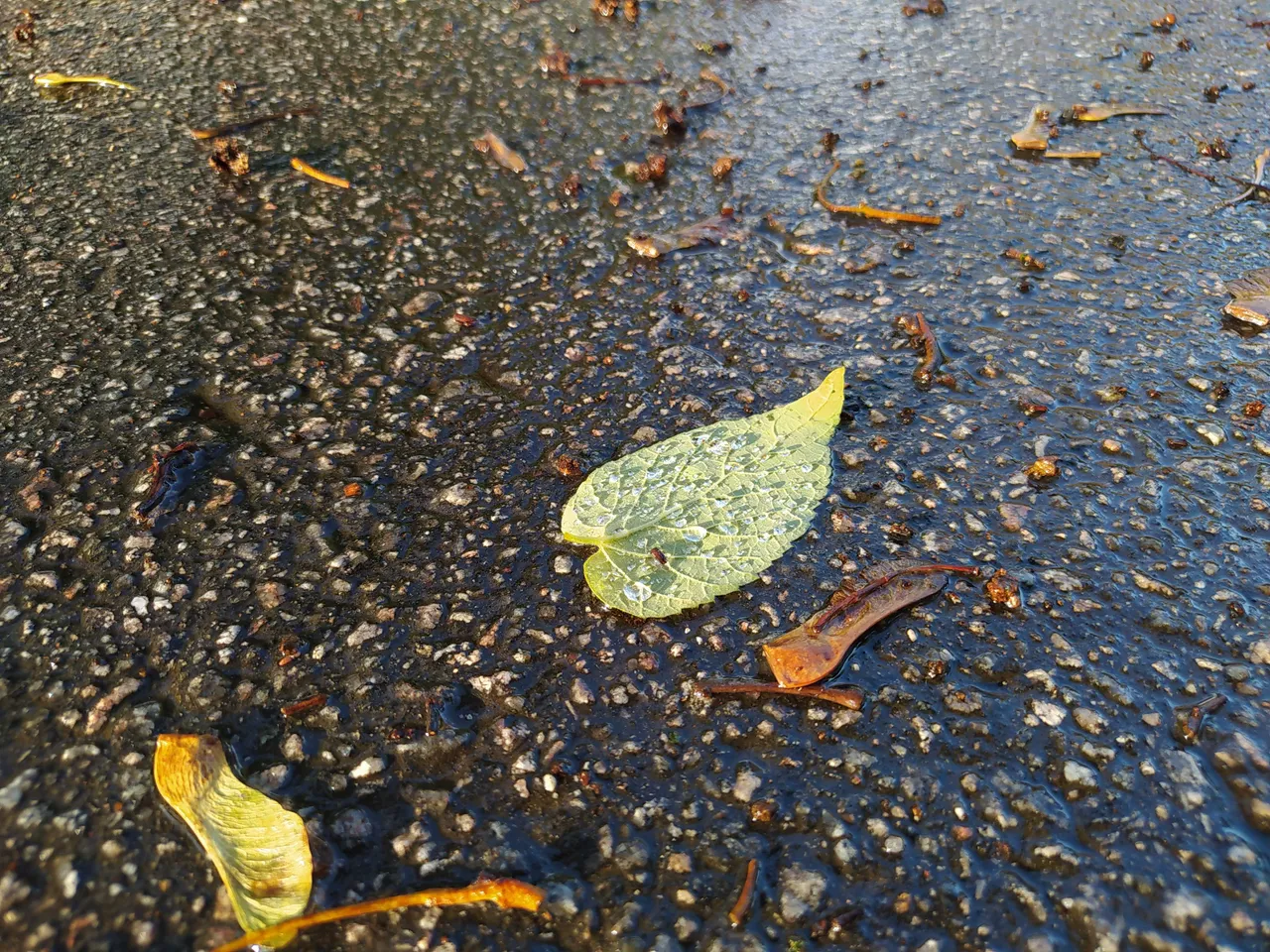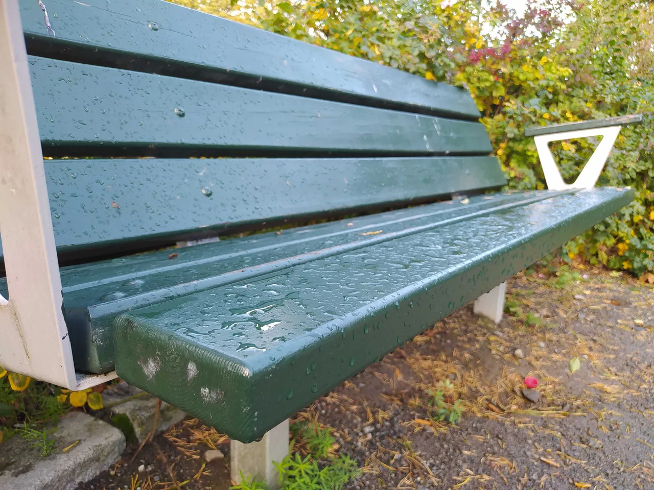 Afternoon views from the park, and above you can see it's wet and some branches had fallen too, and below some water drops on a leaf and a bench.