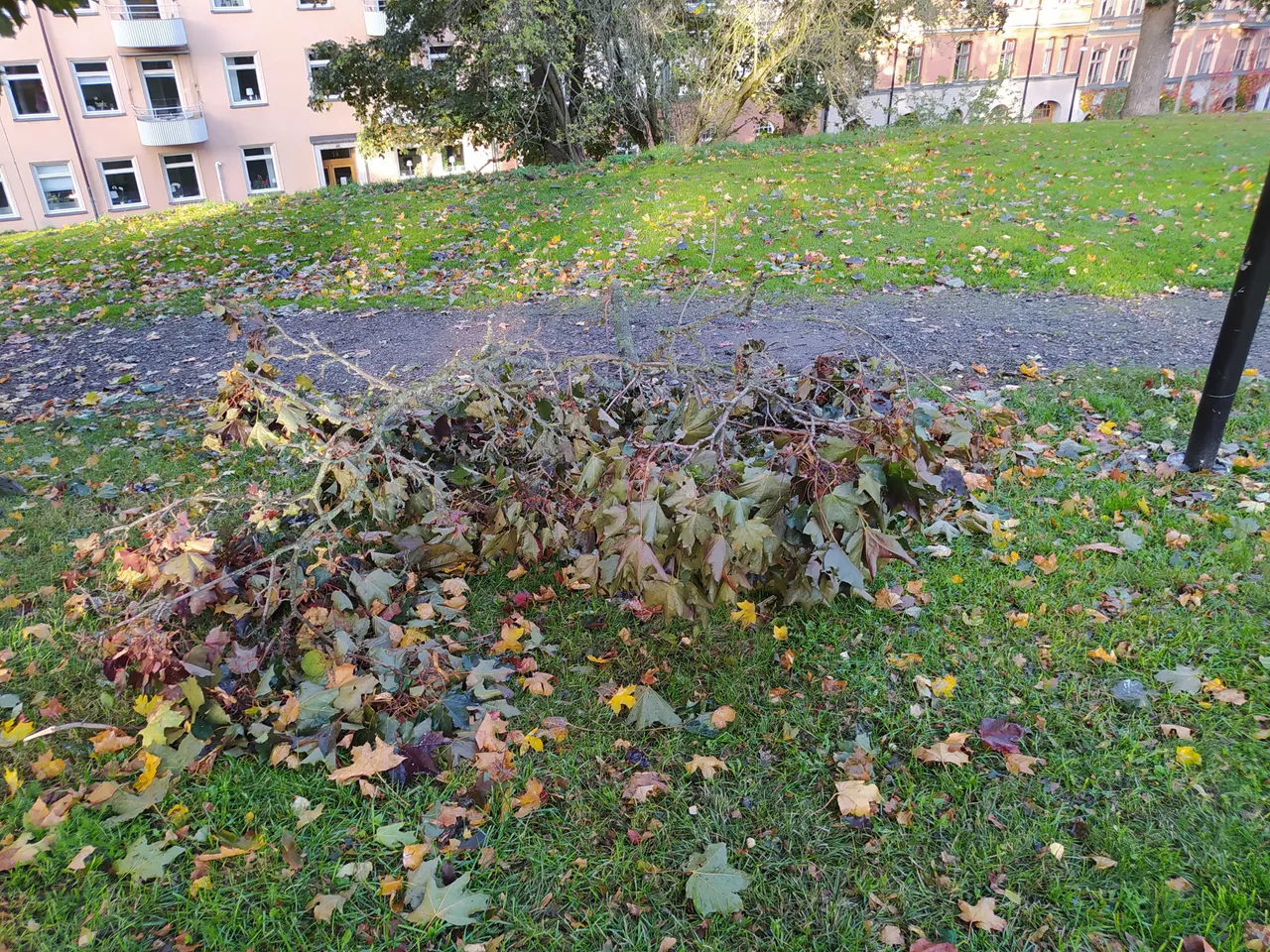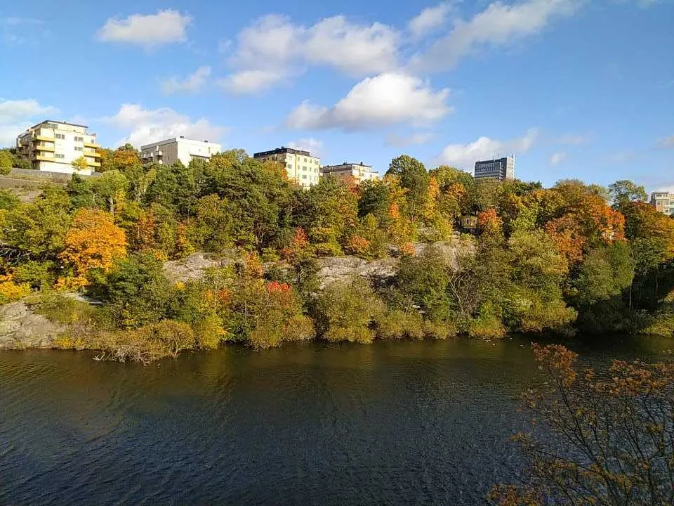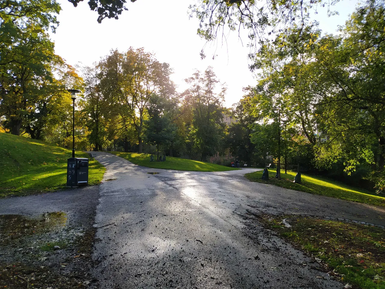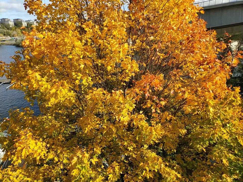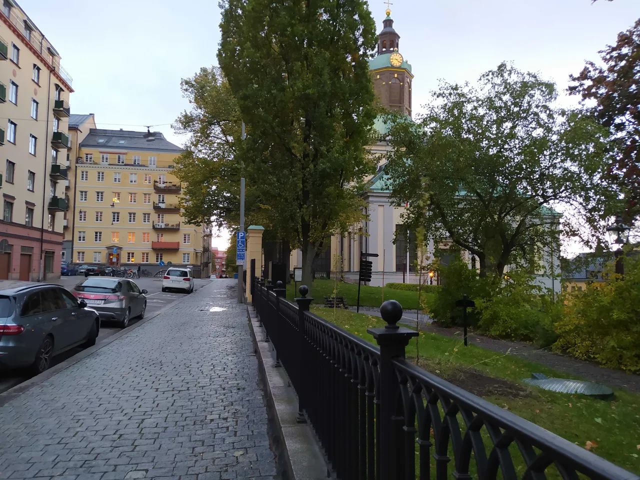 Above you see some fallen maple leaves in fall colors from the park, and the picture below was taken a bit later and of the Kungsholmen Church and just before it started raining a second time.
