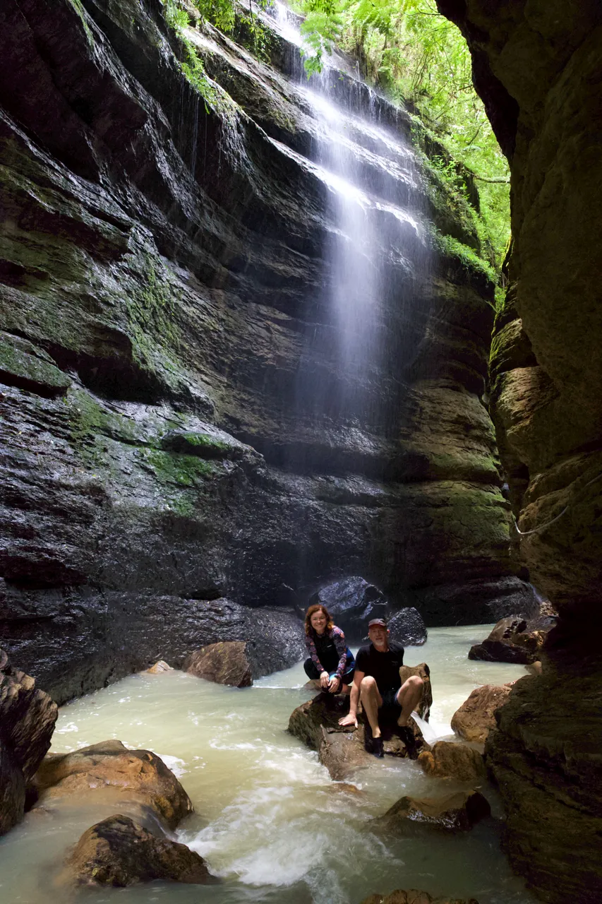 Dieser Canyon bietet eine atemberaubende Kulisse. Am Ende des Canyon angekommen, legte ich das Equipment ab, um mich in Ruhe dort umzuschauen. Auf dem Foto unten zeige ich, wie ich die Kamera einrichte. Es war nicht ganz einfach, da man entweder passende Felsen für das Stativ finden- oder das Stativ im Wasser aufstellen mußte. Hilfreich war wieder mein Flipside 300 Rucksack von Lowepro. Den kann man wie einen Bauchladen vor sich öffnen ohne ihn abzulegen. Diesen Rucksack habe ich vor 8 Jahren gebraucht gekauft und er begleitet mich bis heute in der ganzen Welt. Ein unglaublich praktisches Teil!