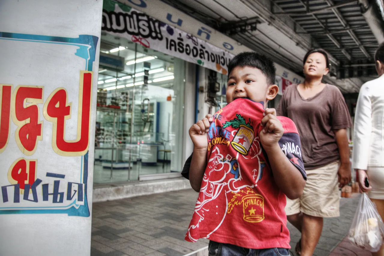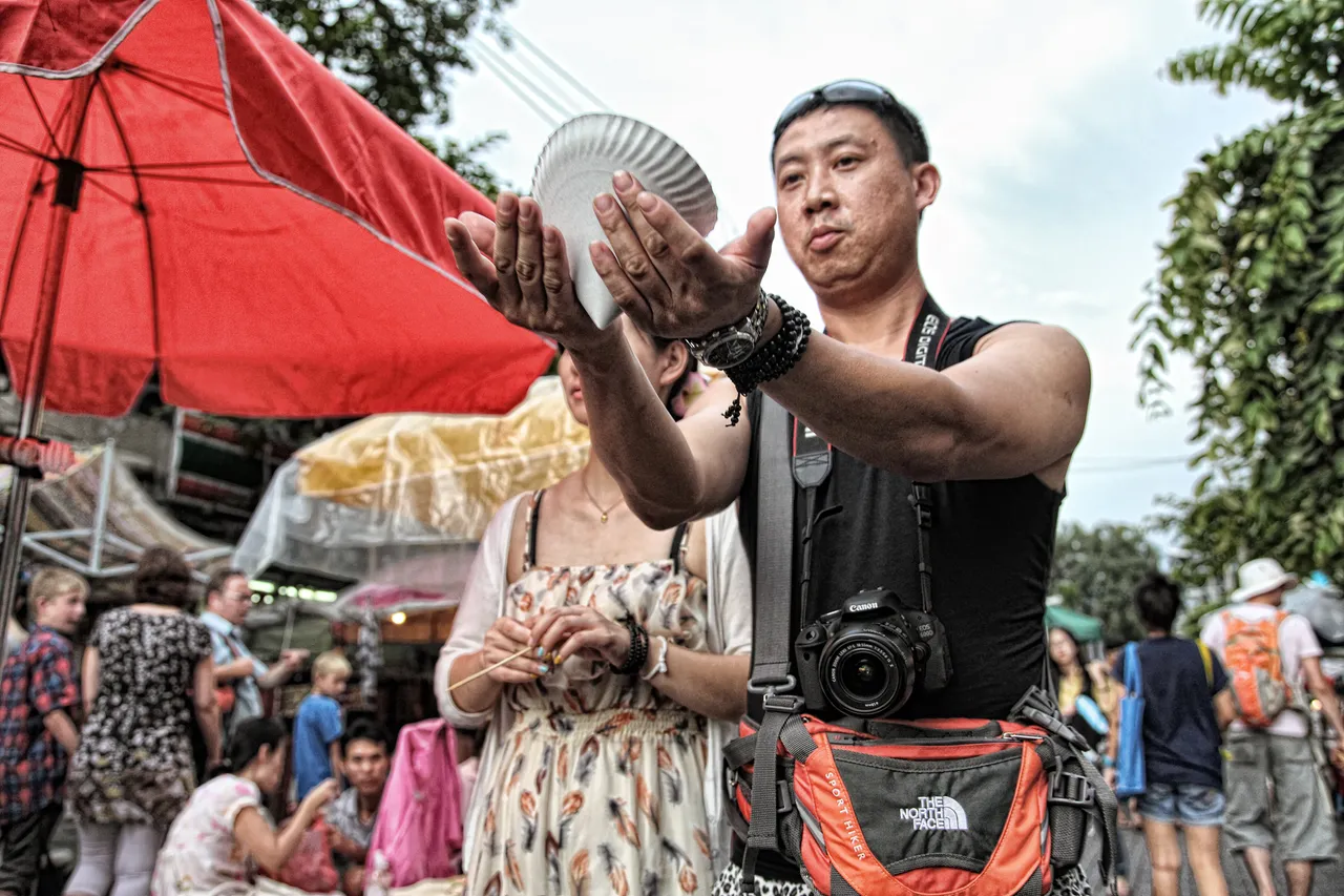 Handle With Care - I have no idea what was in this food-cone for it to be held at arm's-length, it could have been something very precious or perhaps something unpleasant, but given the camera around his neck I suspect it was more about checking photographic possiblities.