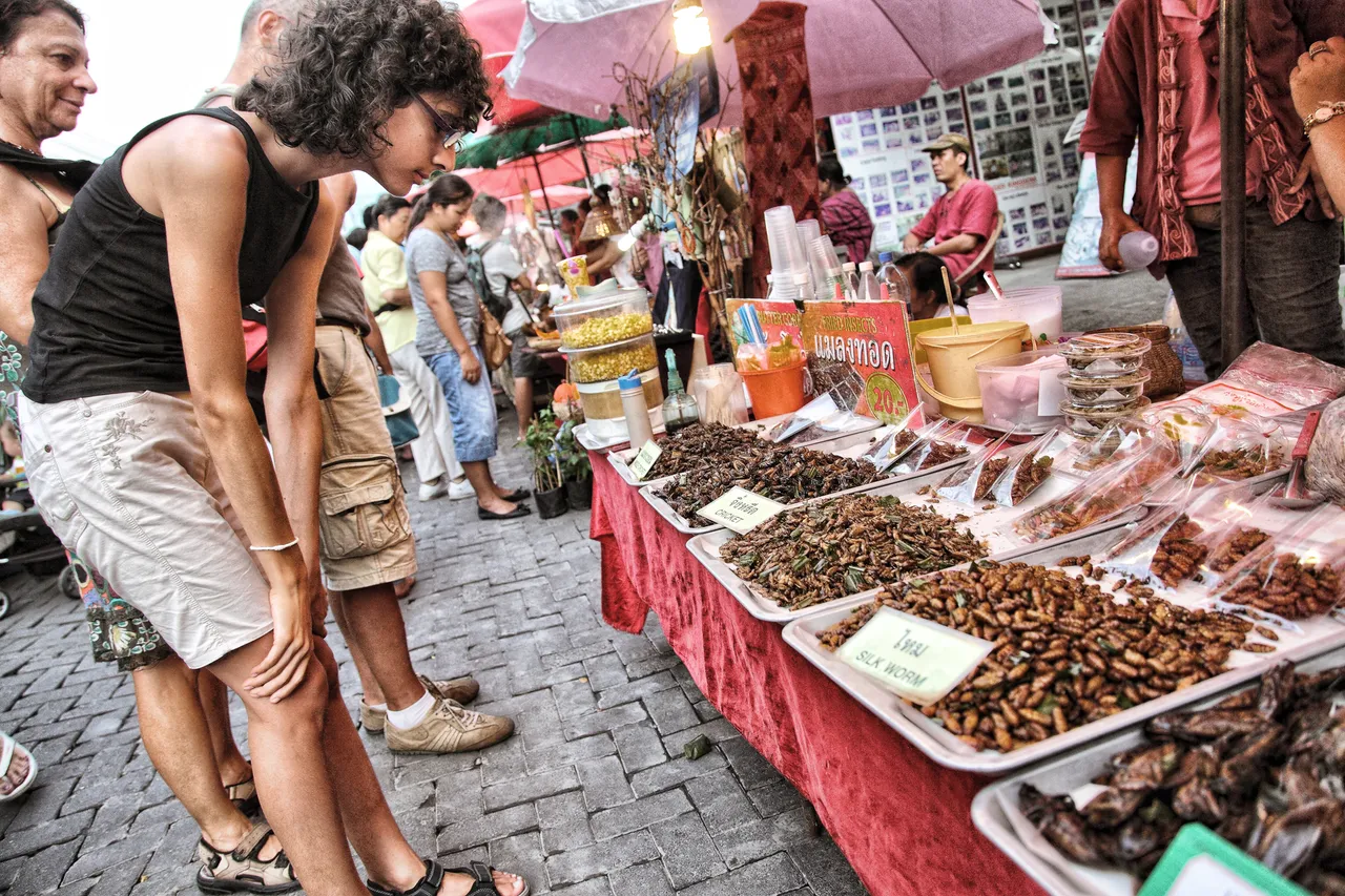 Buy a Bag of Bugs? - insects of various kinds are eaten in Thailand but they are mainly sold like this as a novelty item in any market that gets a lot of foreign tourists. Eating a packet of bugs is always a great story to take home with you. Here we had crickets, mole crickets, silk worms and waterbugs. They are all fried in the same way so the taste is basically the same, it just depends if you'd prefer the softer worms or the more crunchy crickets.