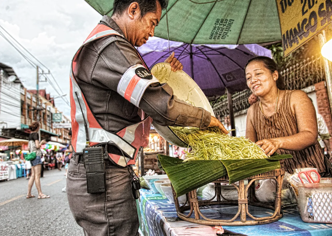 Community Policing - a friendly policeman going beyond his call of duty to help prepare unripe mango for one of the excellent Thai spicy salad "yam" dishes.