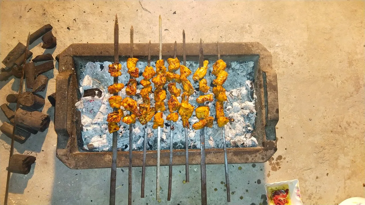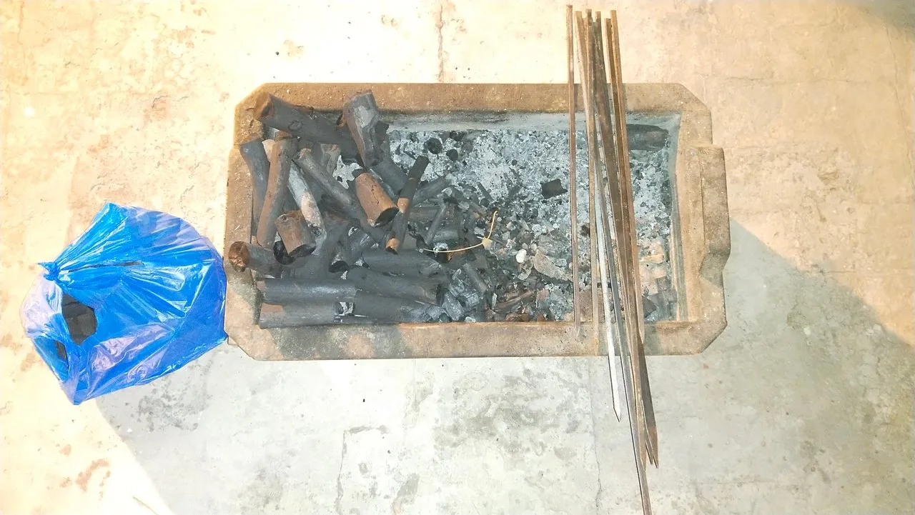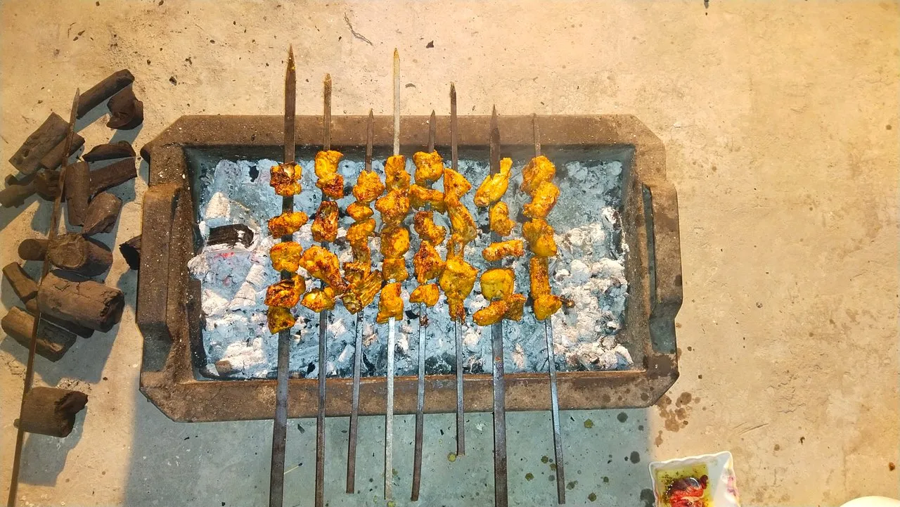 It took us almost half an hour to do that. After burning the coal we start to put chicken pieces on these metal BBQ sticks.