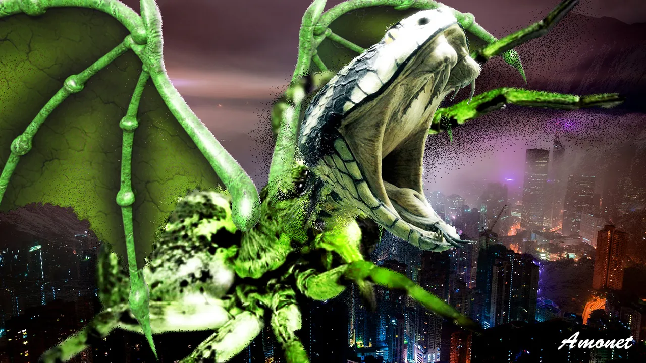 The monster I create with a spider, a snake's head and dragon's wings, each part in several layers, first intertwined with the background and then sharply over it. Change all the parts to a deep green colour, thus evening out the colour of the beast.