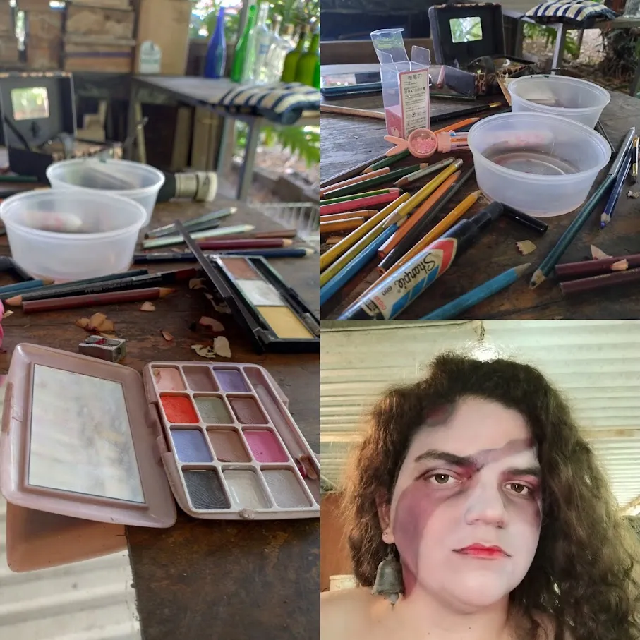 Mi kit de maquillaje para este proyecto estaba conformado por un lápiz negro delineador de ojos, un lápiz rojo delineador de labios y un par de paletas pequeñitas y superbásicas de sombras (que llevan demasiados años en mi armario), además un labial medio machucado, una tinta de labios y un rubor. Hasta ahí estos elementos eran adecuados o medianamente adecuados para ser usados en la piel, pero me faltaban matices, así que recurrí a mis lápices de colores. Sí, una apuesta un poco arriesgada, pero de niña me hacía tatuajes dibujando en mi piel con los lápices de colores (claro, mojando la punta en agua) y nunca me pasó nada.