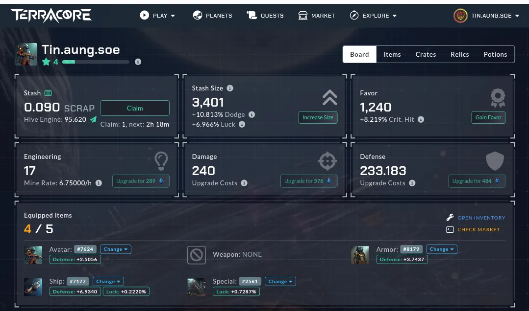 Now my TerraCore Game Stats are Stash Size 3401, Favor 1240, Engineering 17, Damage 240, Defense 233.183 and Equipments Horizon Ship, Scanner Droid Avatar, Heavy Battle Suit and Torque Wrench.