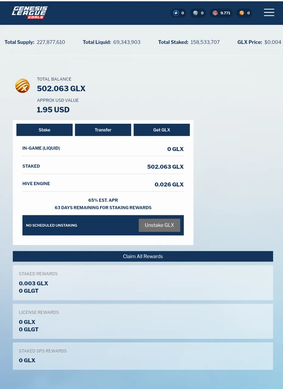 Today, there are 502.063 GLX tokens and 9.771 GLGT tokens in the Genesis League Goals game.