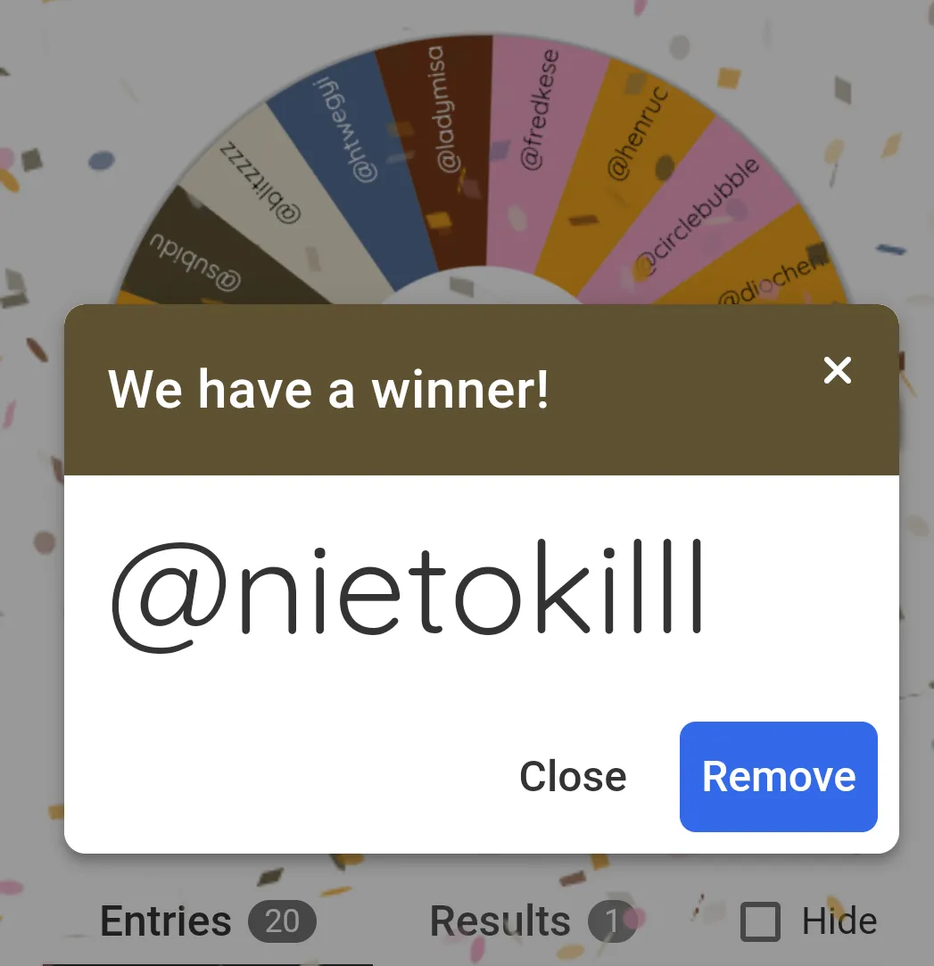 These usernames were typed in https://wheelofnames.com/ Spin Chart and I spinned.