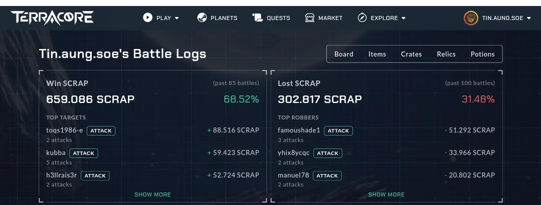 In the last 100 Battle Fight of TerraCore, I have won 659.086 SCRAP with a Win Rate of 68.52% and lost 302.817 SCRAP with a Lost Rate of 31.48%.